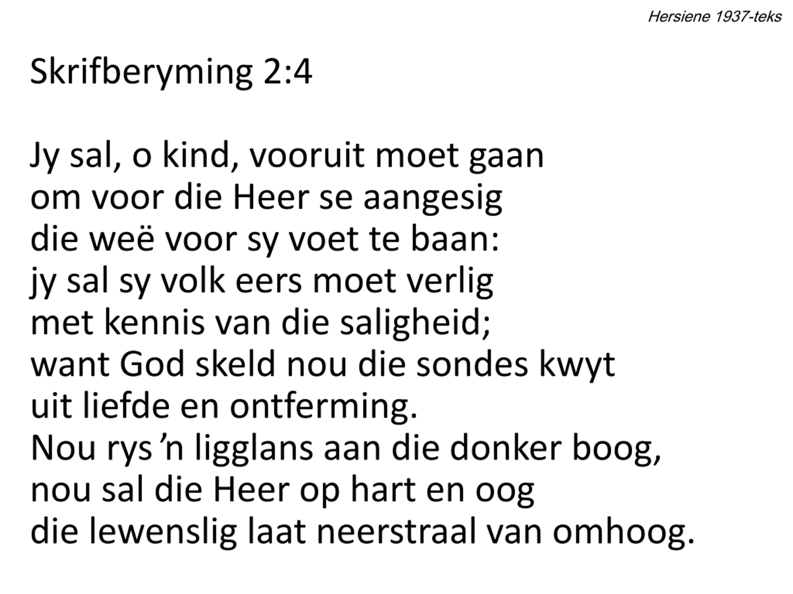 Hersiene 1937-teks Skrifberyming 2:4 Jy sal, o kind, vooruit moet gaan om voor die Heer se aangesig die we voor sy voet te baan: jy sal sy volk eers moet verlig met kennis van die saligheid; want God skeld nou die sondes kwyt uit liefde en ontferming. Nou rys ligglans aan die donker boog, nou sal die Heer op hart en oog die lewenslig laat neerstraal van omhoog.
