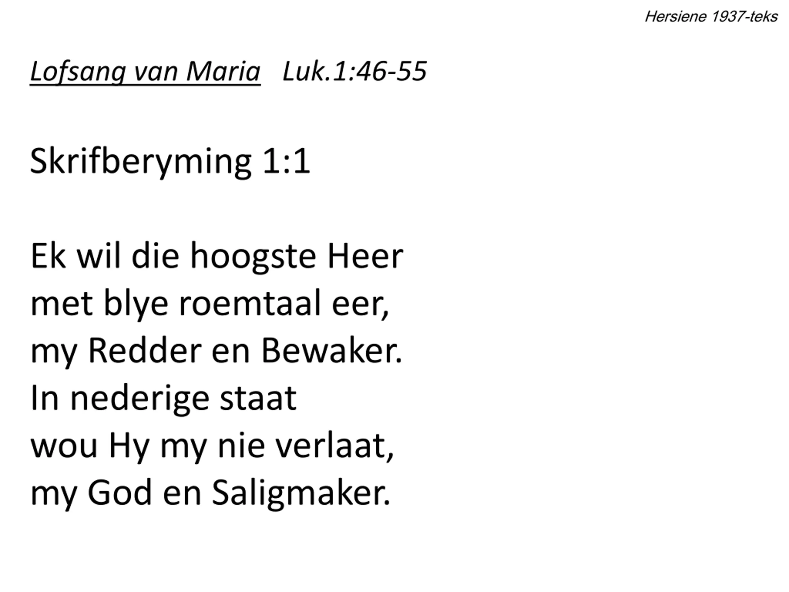 Hersiene 1937-teks Lofsang van Maria Luk.1:46-55 Skrifberyming 1:1 Ek wil die hoogste Heer met blye roemtaal eer, my Redder en Bewaker. In nederige staat wou Hy my nie verlaat, my God en Saligmaker.