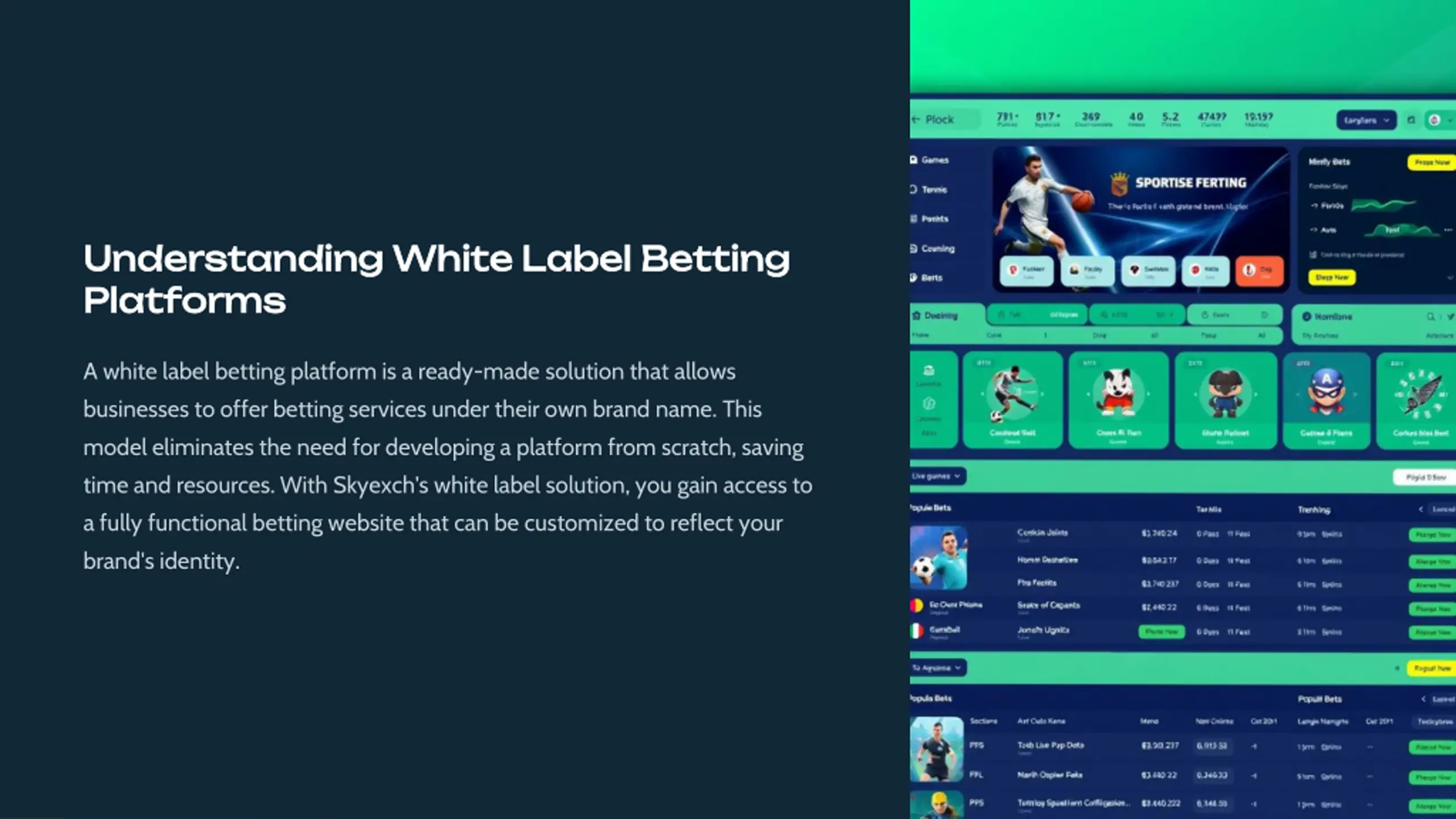 Understanding White Label Betting Understanding White Label Betting Platforms Platforms A white label betting platform is a ready-made solution that allows businesses to offer betting services under their own brand name. This model eliminates the need for developing a platform from scratch, saving time and resources. With Skyexch's white label solution, you gain access to a fully functional betting website that can be customized to reflect your brand's identity. preencoded.png