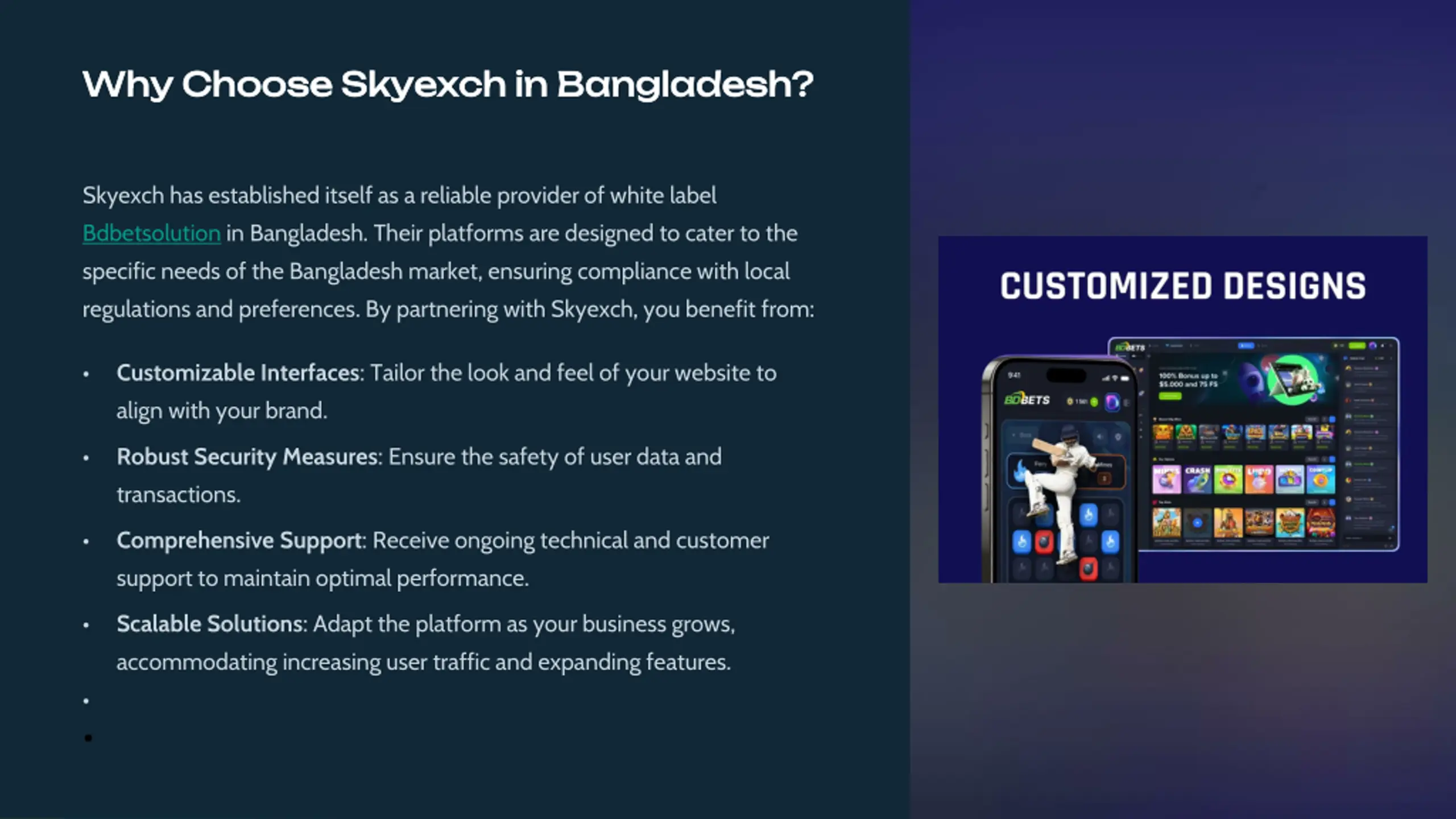 Why Choose Skyexch in Bangladesh? Why Choose Skyexch in Bangladesh? Skyexch has established itself as a reliable provider of white label Bdbetsolution in Bangladesh. Their platforms are designed to cater to the specific needs of the Bangladesh market, ensuring compliance with local regulations and preferences. By partnering with Skyexch, you benefit from: Customizable Interfaces: Tailor the look and feel of your website to align with your brand. Robust Security Measures: Ensure the safety of user data and transactions. Comprehensive Support: Receive ongoing technical and customer support to maintain optimal performance. Scalable Solutions: Adapt the platform as your business grows, accommodating increasing user traffic and expanding features. preencoded.png