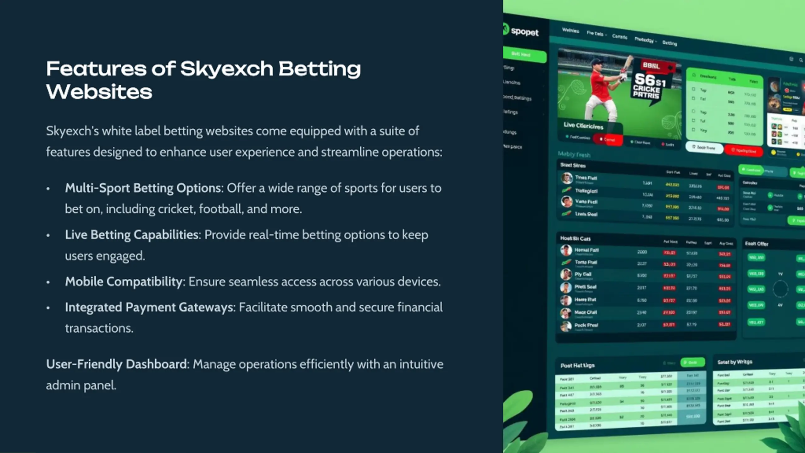 Features of Skyexch Betting Features of Skyexch Betting Websites Websites Skyexch's white label betting websites come equipped with a suite of features designed to enhance user experience and streamline operations: Multi-Sport Betting Options: Offer a wide range of sports for users to bet on, including cricket, football, and more. Live Betting Capabilities: Provide real-time betting options to keep users engaged. Mobile Compatibility: Ensure seamless access across various devices. Integrated Payment Gateways: Facilitate smooth and secure financial transactions. User-Friendly Dashboard: Manage operations efficiently with an intuitive admin panel. preencoded.png