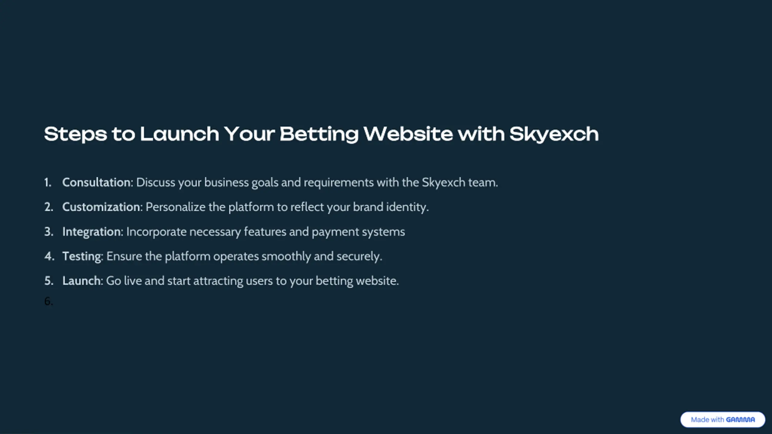 Steps to Launch Your Betting Website with Skyexch Steps to Launch Your Betting Website with Skyexch 1. Consultation: Discuss your business goals and requirements with the Skyexch team. 2. Customization: Personalize the platform to reflect your brand identity. 3. Integration: Incorporate necessary features and payment systems 4. Testing: Ensure the platform operates smoothly and securely. 5. Launch: Go live and start attracting users to your betting website. 6. preencoded.png