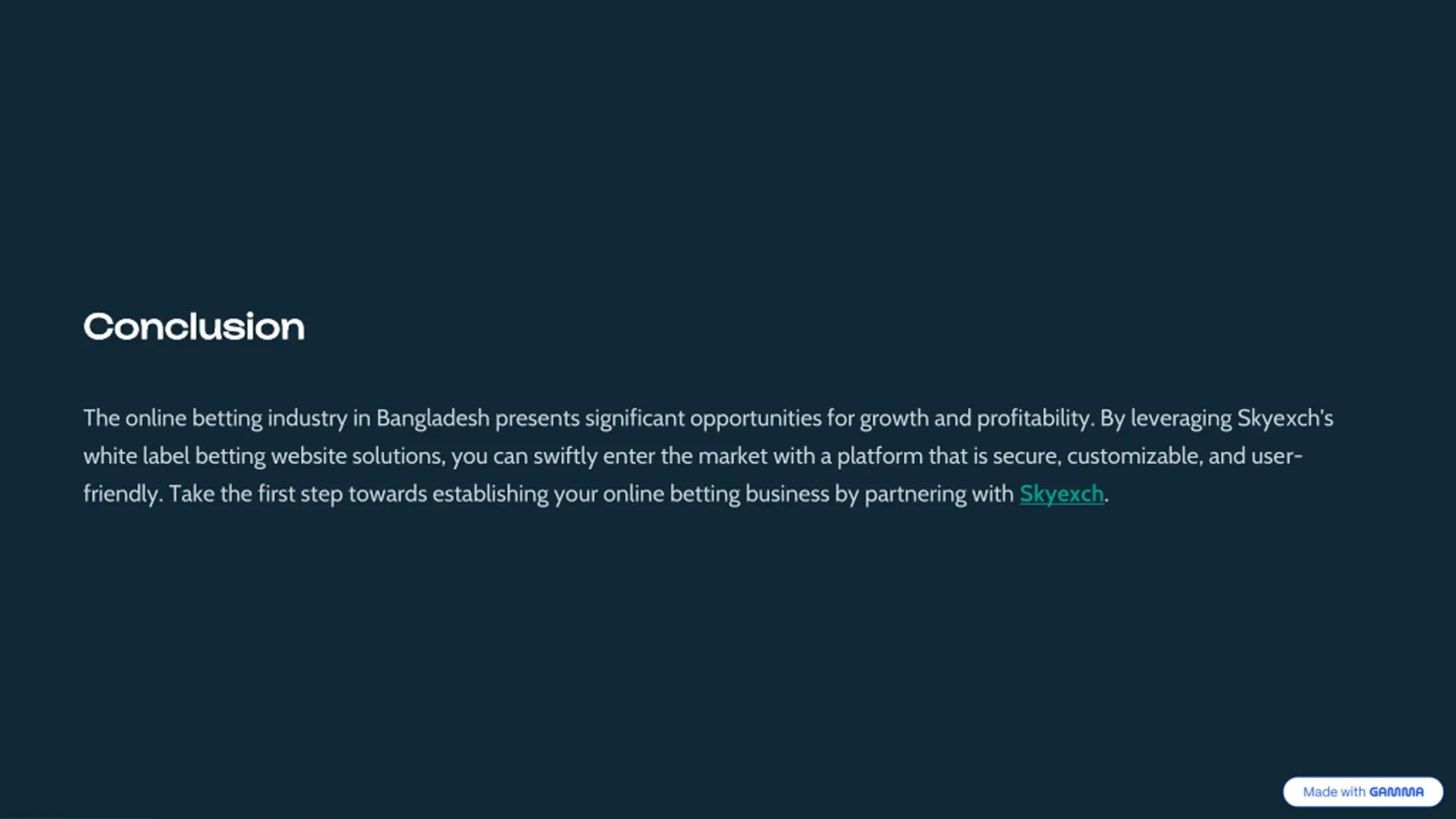 Conclusion Conclusion The online betting industry in Bangladesh presents significant opportunities for growth and profitability. By leveraging Skyexch's white label betting website solutions, you can swiftly enter the market with a platform that is secure, customizable, and user- friendly. Take the first step towards establishing your online betting business by partnering with Skyexch. preencoded.png