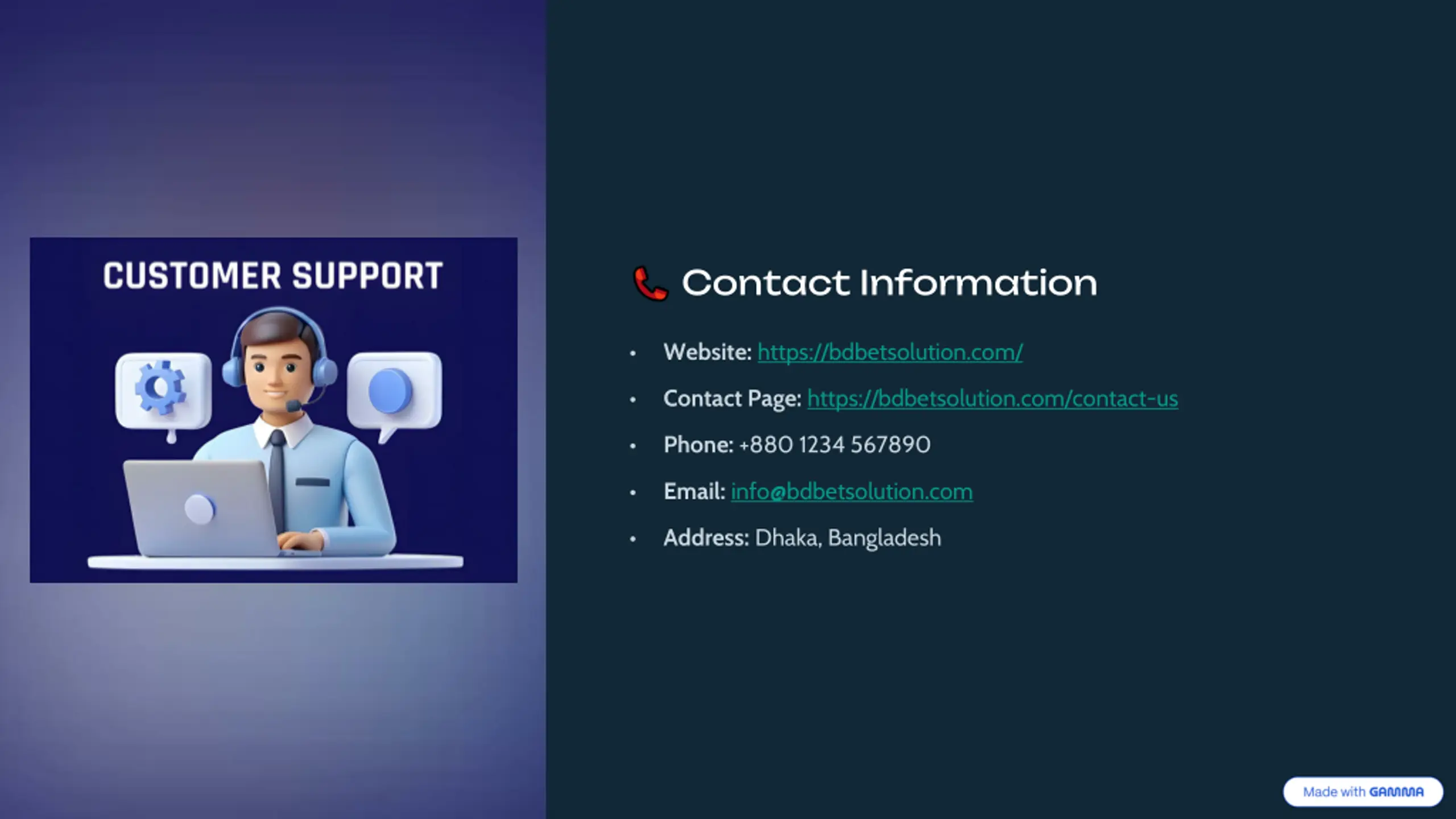 Contact Information Website:https://bdbetsolution.com/ Contact Page: https://bdbetsolution.com/contact-us Phone:+880 1234 567890 Email: info@bdbetsolution.com Address:Dhaka, Bangladesh preencoded.png