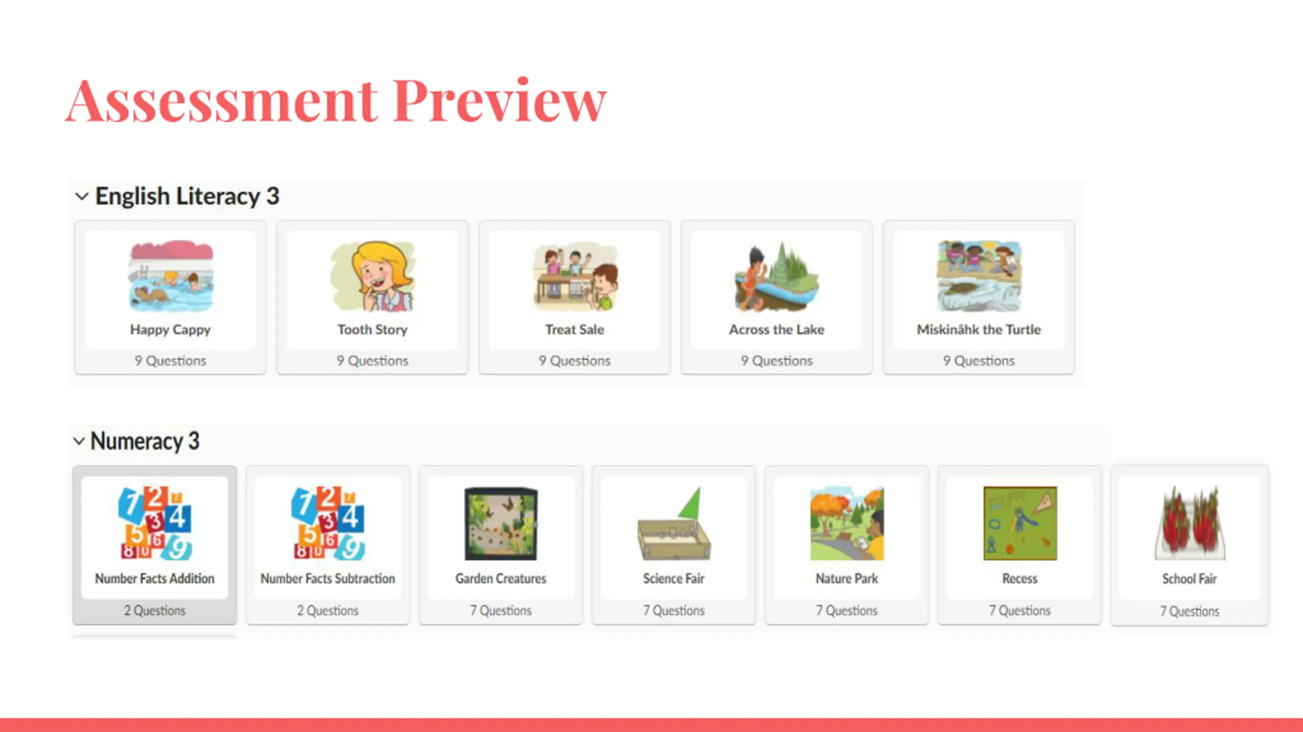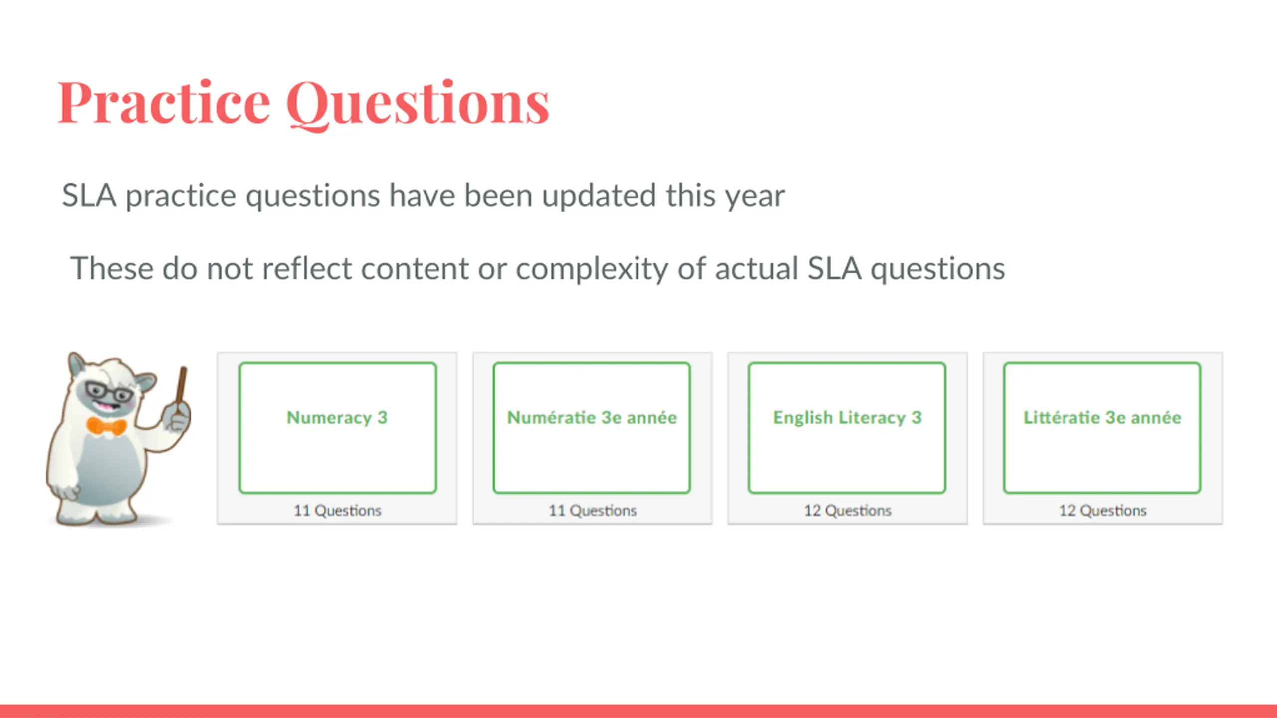 Four Components of the SLA The SLA is based on outcomes related to literacy and numeracy in language arts and mathematics in Alberta s current Grade 2 provincial programs of study. Some questions include contexts from arts education, health, science and social studies. - digital interactive literacy questions (45 questions) - literacy performance task (4 activities) - digital interactive numeracy questions (39 questions) - numeracy performance task (2 activities).