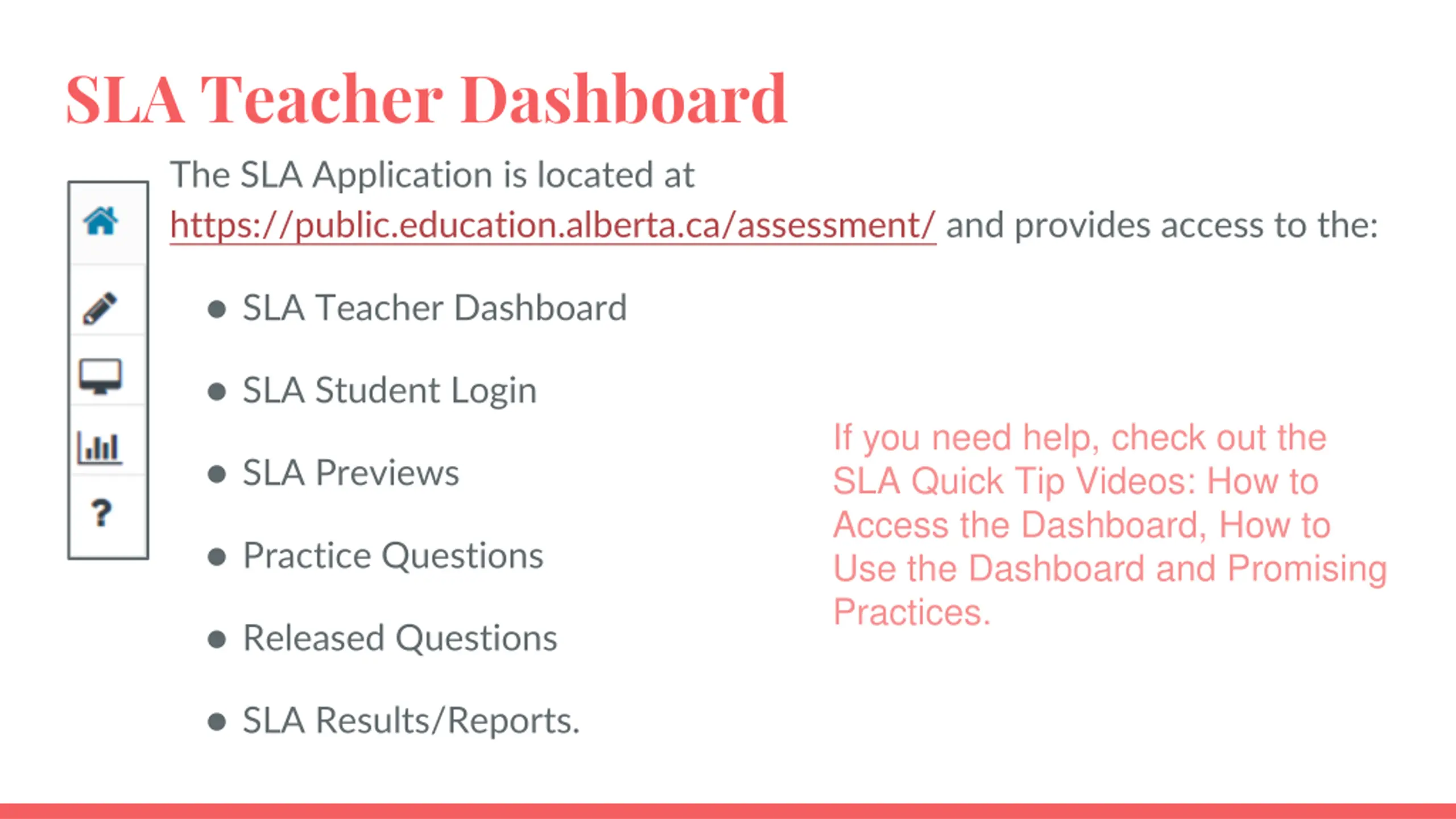 SLA Teacher Dashboard The SLA Application is located at https://public.education.alberta.ca/assessment/ and provides access to the: SLA Teacher Dashboard SLA Student Login If you need help, check out the SLA Quick Tip Videos: How to Access the Dashboard, How to Use the Dashboard and Promising Practices. SLA Previews Practice Questions Released Questions SLA Results/Reports.