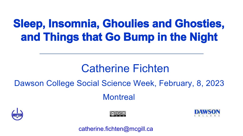 Fichten, C. (2023, February 8). Sleep, insomnia, ghoulies and ghosties, and things that go bump in the night [Invited speaker]. Dawson College Social Science Week, Montreal, QC, Canada. Sleep, Insomnia, Ghoulies and Ghosties, Sleep, Insomnia, Ghoulies and Ghosties, and Things that Go Bump in the Night and Things that Go Bump in the Night Catherine Fichten Dawson College Social Science Week, February, 8, 2023 Montreal catherine.fichten@mcgill.ca