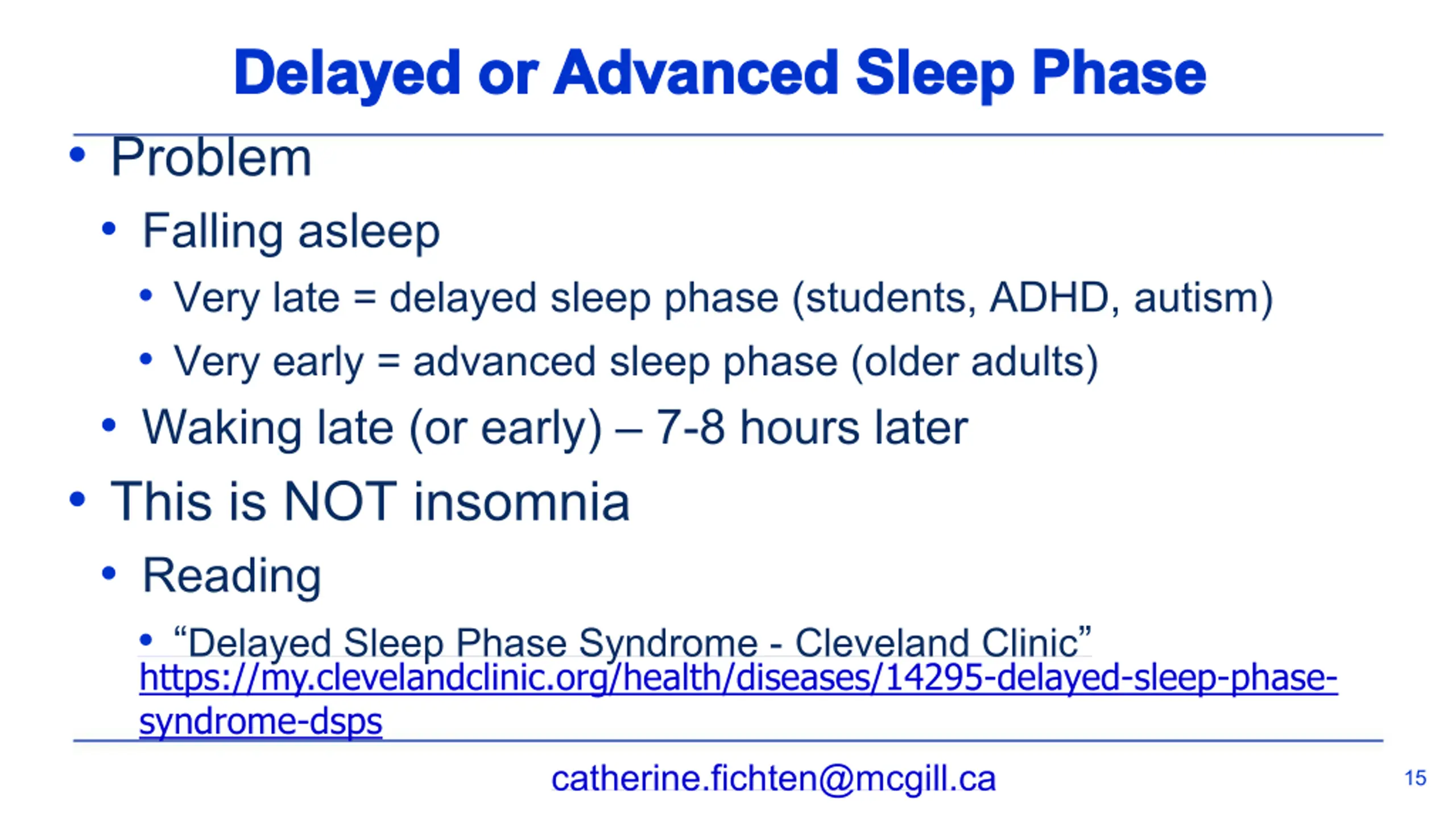 Delayed or Advanced Sleep Phase Delayed or Advanced Sleep Phase Problem Falling asleep Very late = delayed sleep phase (students, ADHD, autism) Very early = advanced sleep phase (older adults) Waking late (or early) 7-8 hours later This is NOT insomnia Reading Delayed Sleep Phase Syndrome - Cleveland Clinic https://my.clevelandclinic.org/health/diseases/14295-delayed-sleep-phase- syndrome-dsps catherine.fichten@mcgill.ca 15