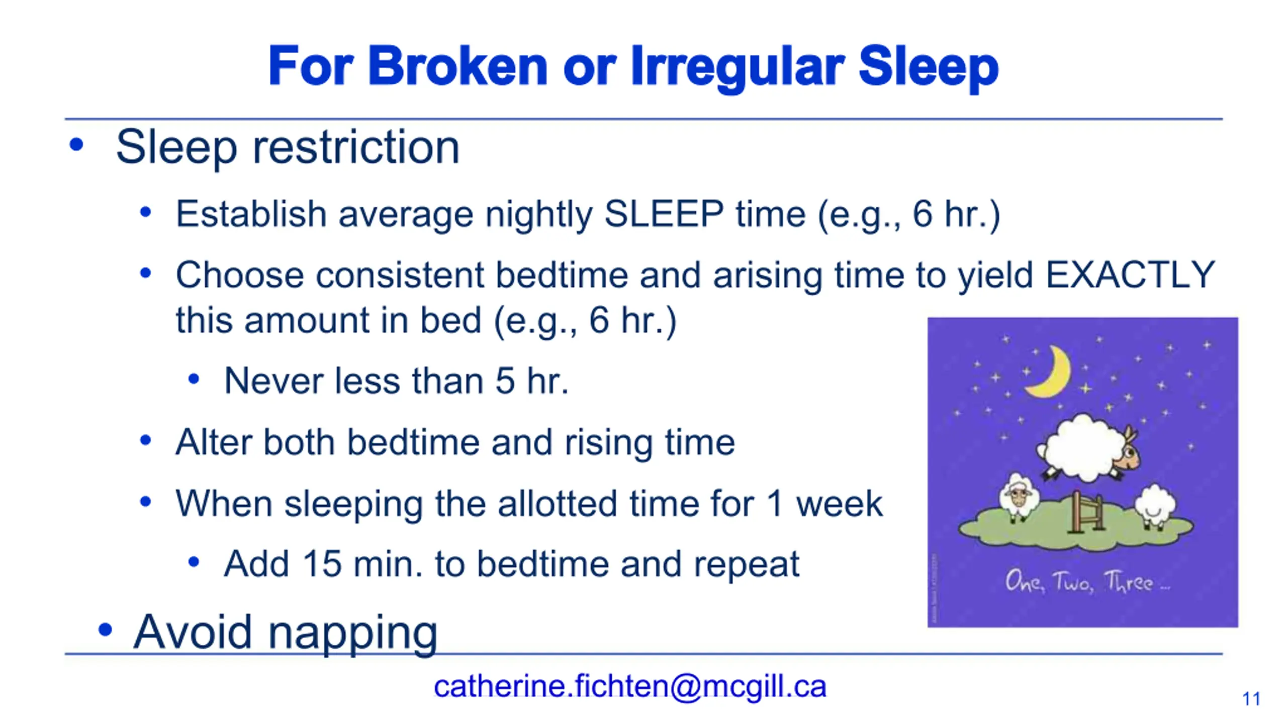For Broken or Irregular Sleep For Broken or Irregular Sleep Sleep restriction Establish average nightly SLEEP time (e.g., 6 hr.) Choose consistent bedtime and arising time to yield EXACTLY this amount in bed (e.g., 6 hr.) Never less than 5 hr. Alter both bedtime and rising time When sleeping the allotted time for 1 week Add 15 min. to bedtime and repeat Avoid napping catherine.fichten@mcgill.ca 11
