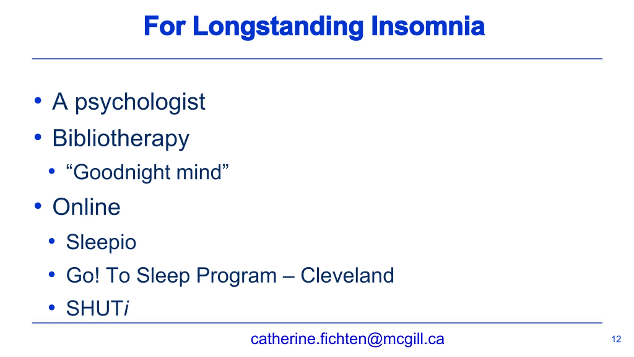 For Longstanding Insomnia For Longstanding Insomnia A psychologist Bibliotherapy Goodnight mind Online Sleepio Go! To Sleep Program Cleveland SHUTi catherine.fichten@mcgill.ca 12