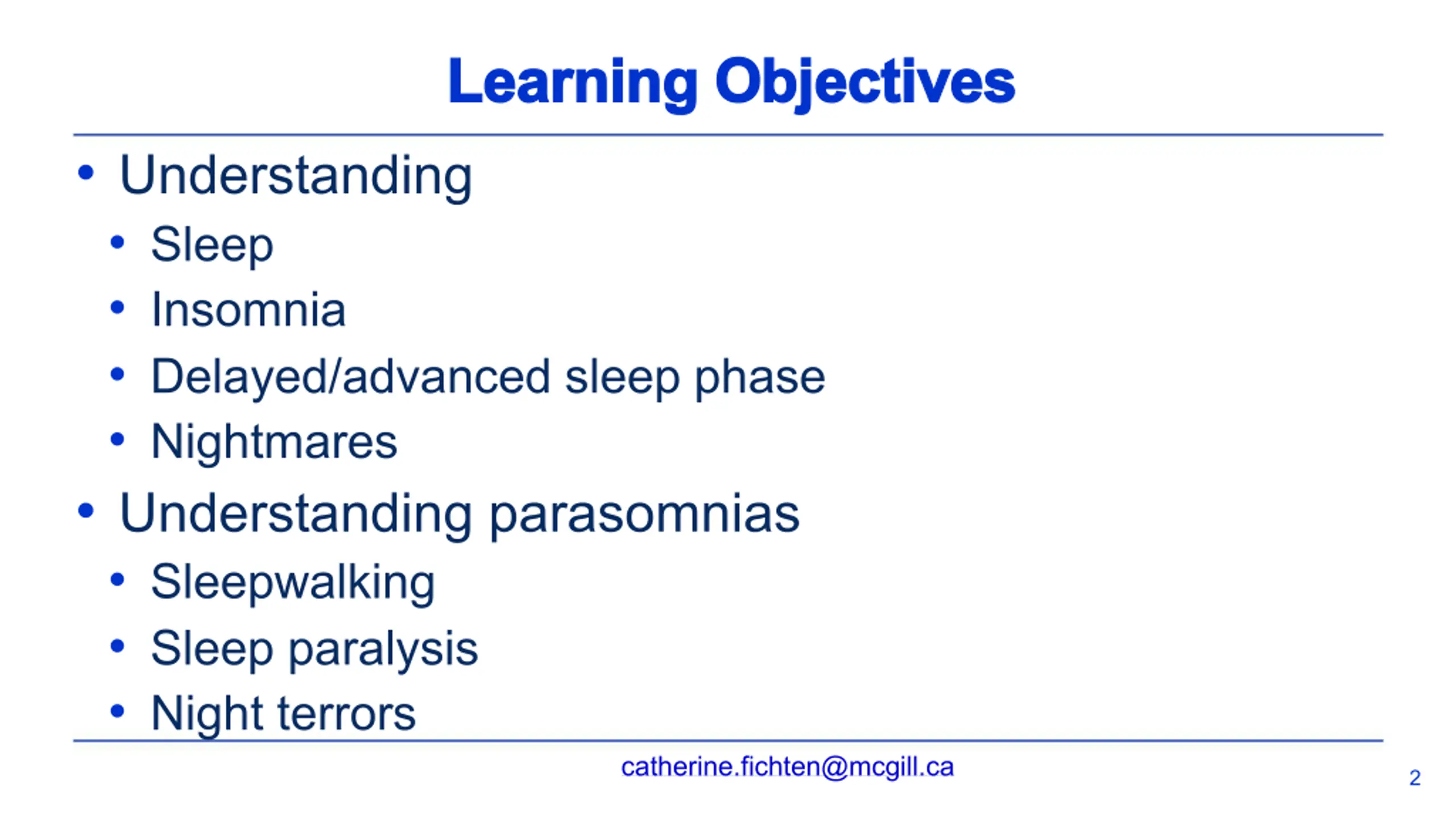 Learning Objectives Learning Objectives Understanding Sleep Insomnia Delayed/advanced sleep phase Nightmares Understanding parasomnias Sleepwalking Sleep paralysis Night terrors catherine.fichten@mcgill.ca 2