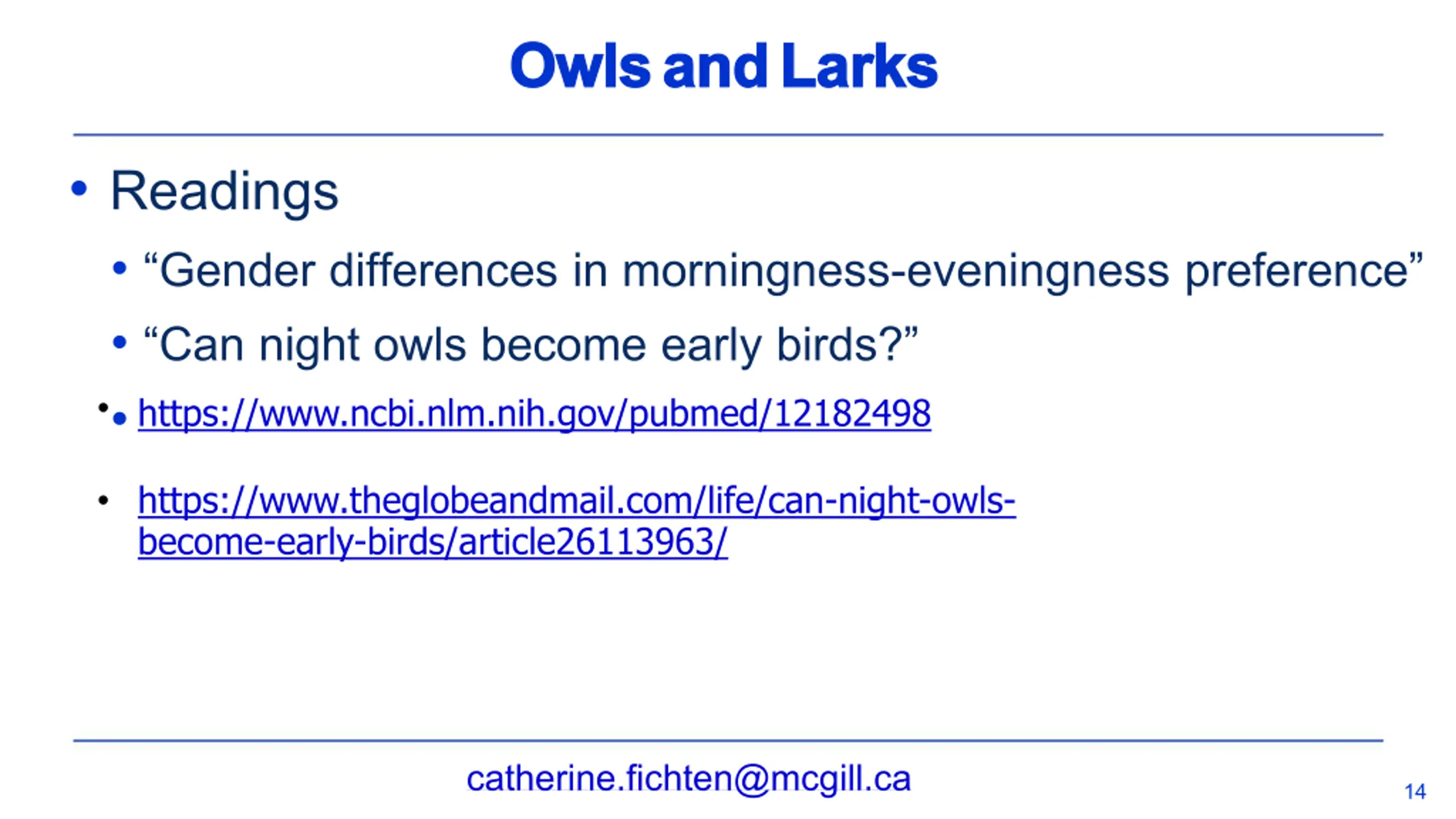 Owls Owlsand andLarks Larks Readings Gender differences in morningness-eveningness preference Can night owls become early birds? https://www.ncbi.nlm.nih.gov/pubmed/12182498 https://www.theglobeandmail.com/life/can-night-owls- become-early-birds/article26113963/ catherine.fichten@mcgill.ca 14