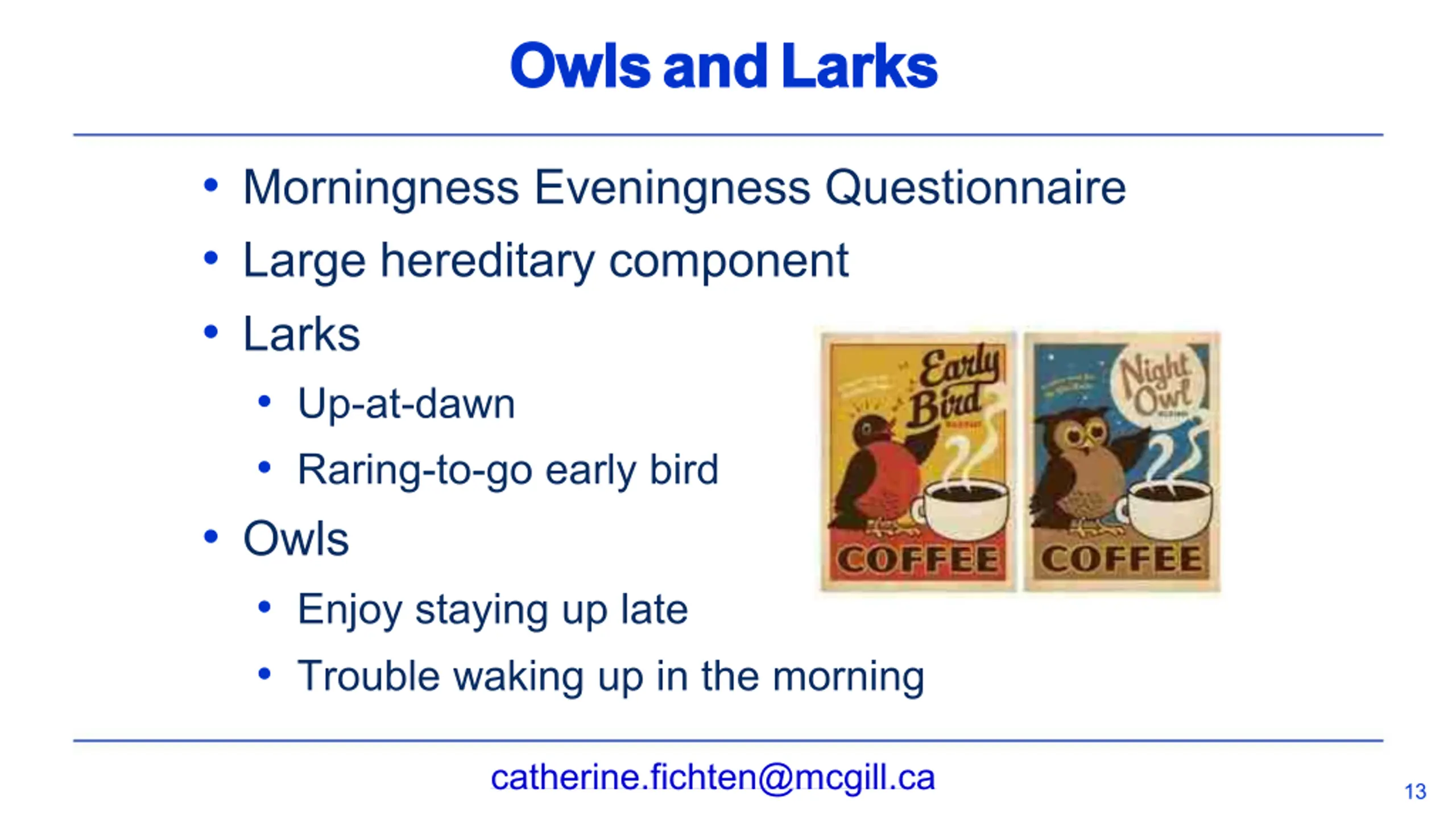 Owls Owlsand andLarks Larks Morningness Eveningness Questionnaire Large hereditary component Larks Up-at-dawn Raring-to-go early bird Owls Enjoy staying up late Trouble waking up in the morning catherine.fichten@mcgill.ca 13