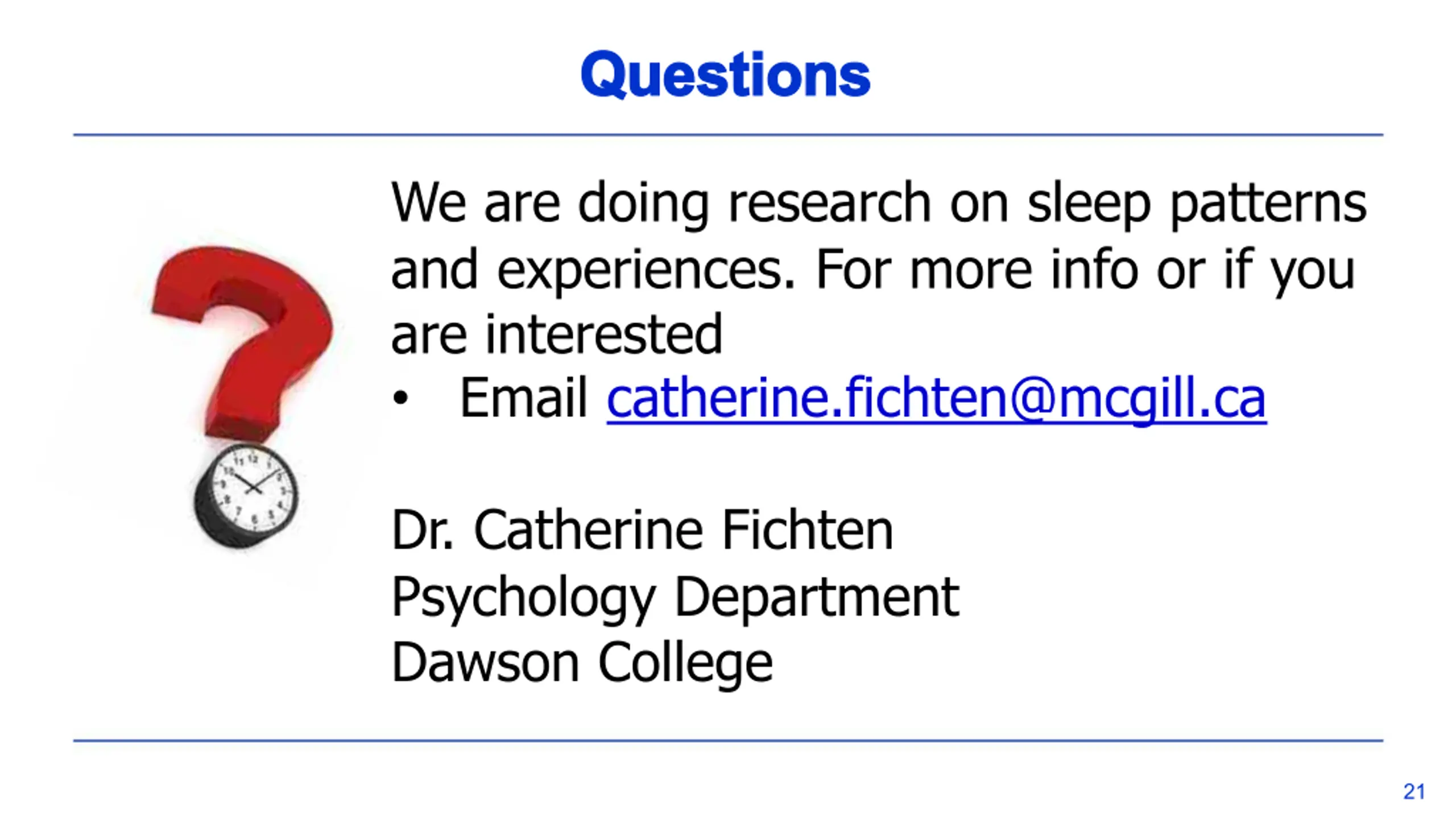 Questions Questions We are doing research on sleep patterns and experiences. For more info or if you are interested Email catherine.fichten@mcgill.ca Dr. Catherine Fichten Psychology Department Dawson College 21