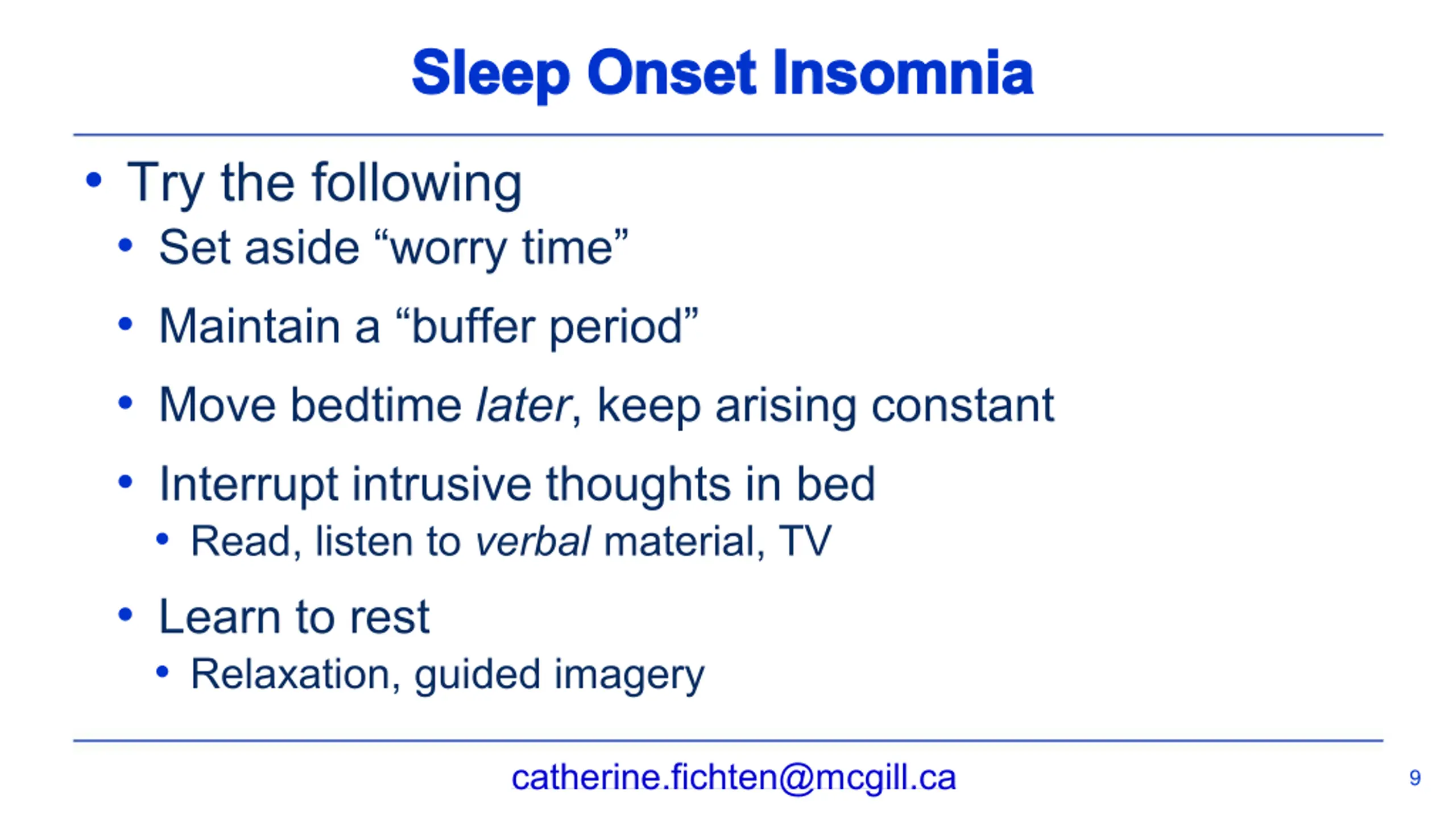 Sleep Onset Insomnia Sleep Onset Insomnia Try the following Set aside worry time Maintain a buffer period Move bedtime later, keep arising constant Interrupt intrusive thoughts in bed Read, listen to verbal material, TV Learn to rest Relaxation, guided imagery catherine.fichten@mcgill.ca 9