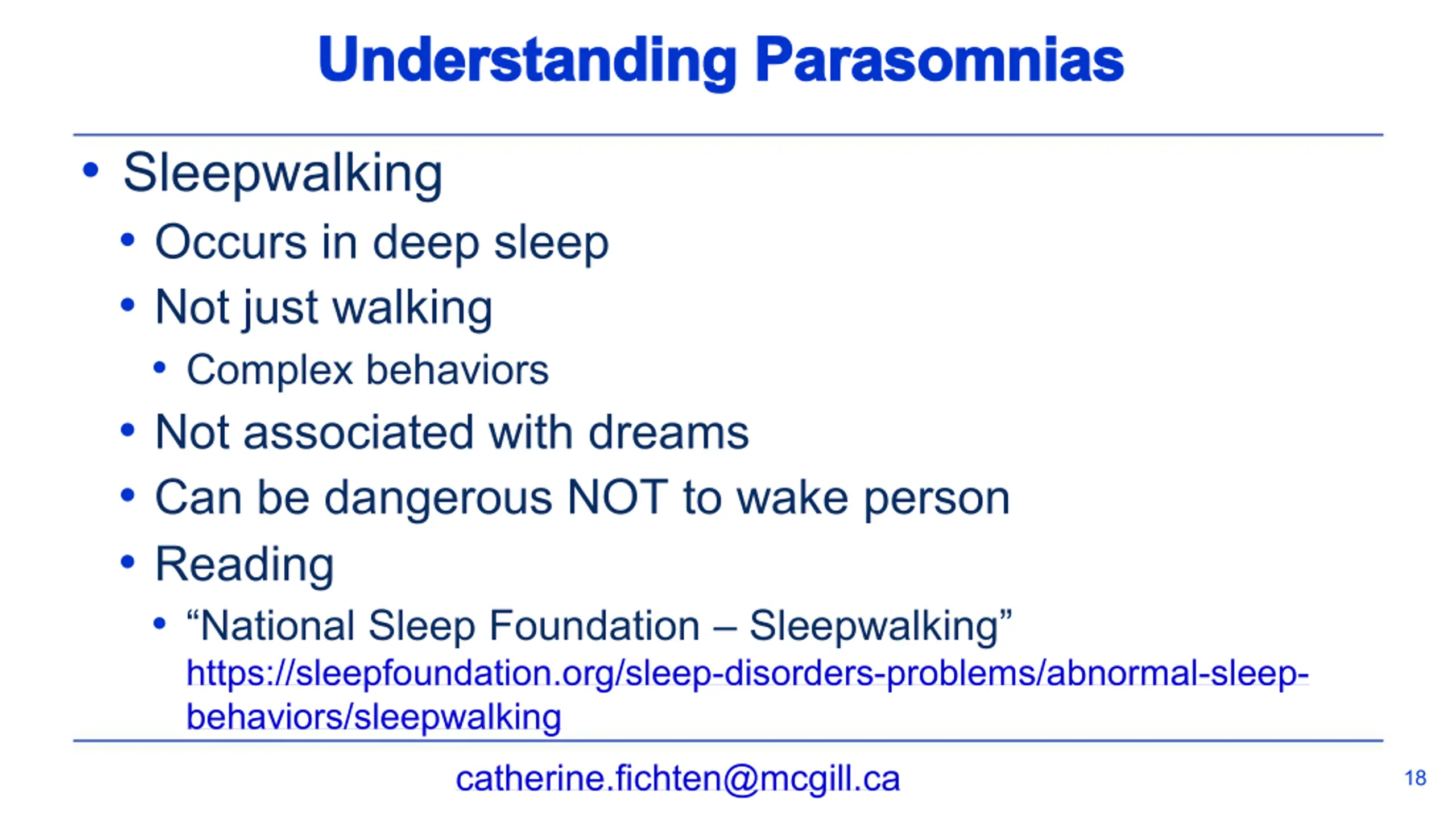 Understanding Parasomnias Understanding Parasomnias Sleepwalking Occurs in deep sleep Not just walking Complex behaviors Not associated with dreams Can be dangerous NOT to wake person Reading National Sleep Foundation Sleepwalking https://sleepfoundation.org/sleep-disorders-problems/abnormal-sleep- behaviors/sleepwalking catherine.fichten@mcgill.ca 18