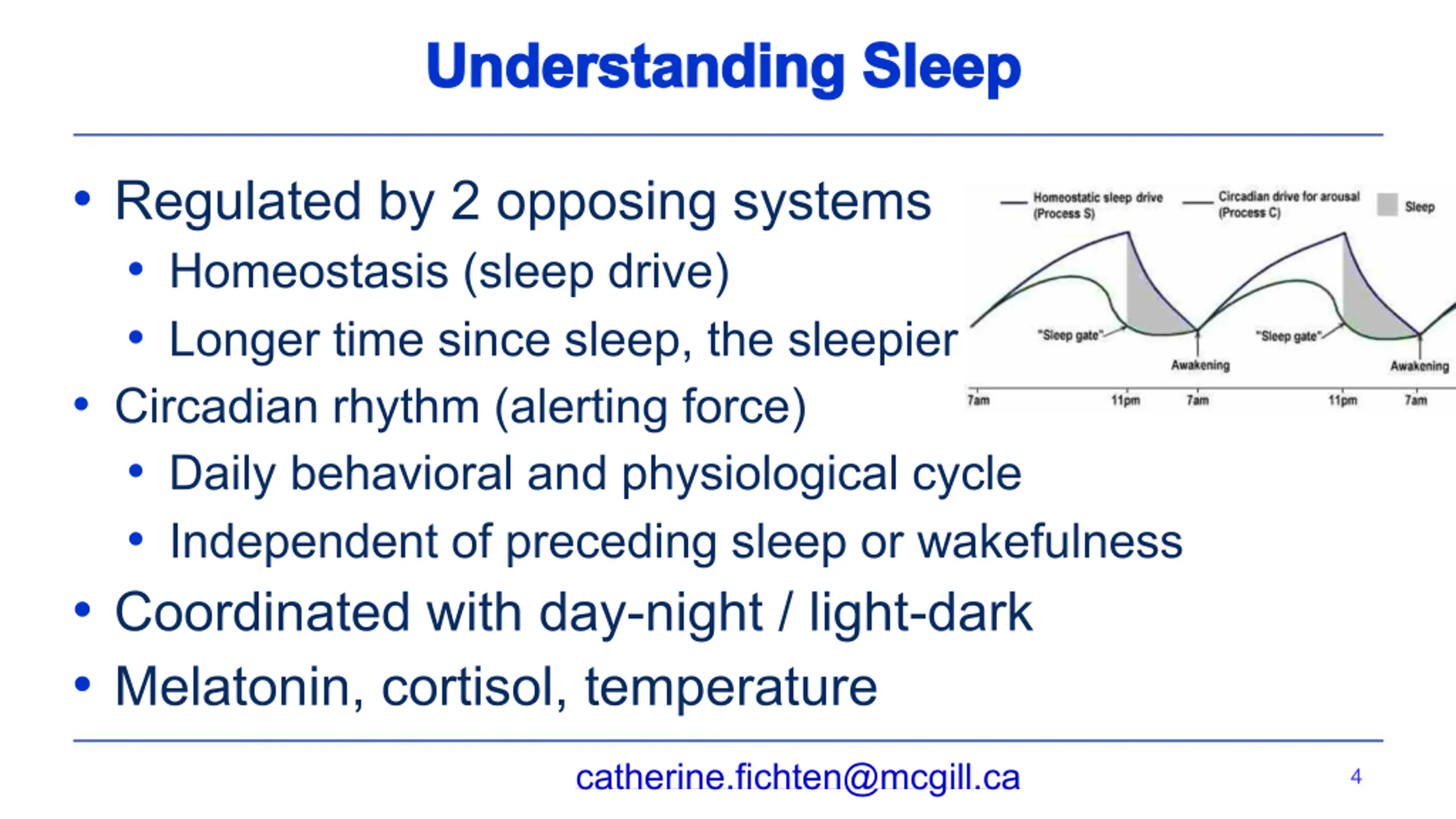Understanding Sleep Understanding Sleep Regulated by 2 opposing systems Homeostasis (sleep drive) Longer time since sleep, the sleepier Circadian rhythm (alerting force) Daily behavioral and physiological cycle Independent of preceding sleep or wakefulness Coordinated with day-night / light-dark Melatonin, cortisol, temperature catherine.fichten@mcgill.ca 4