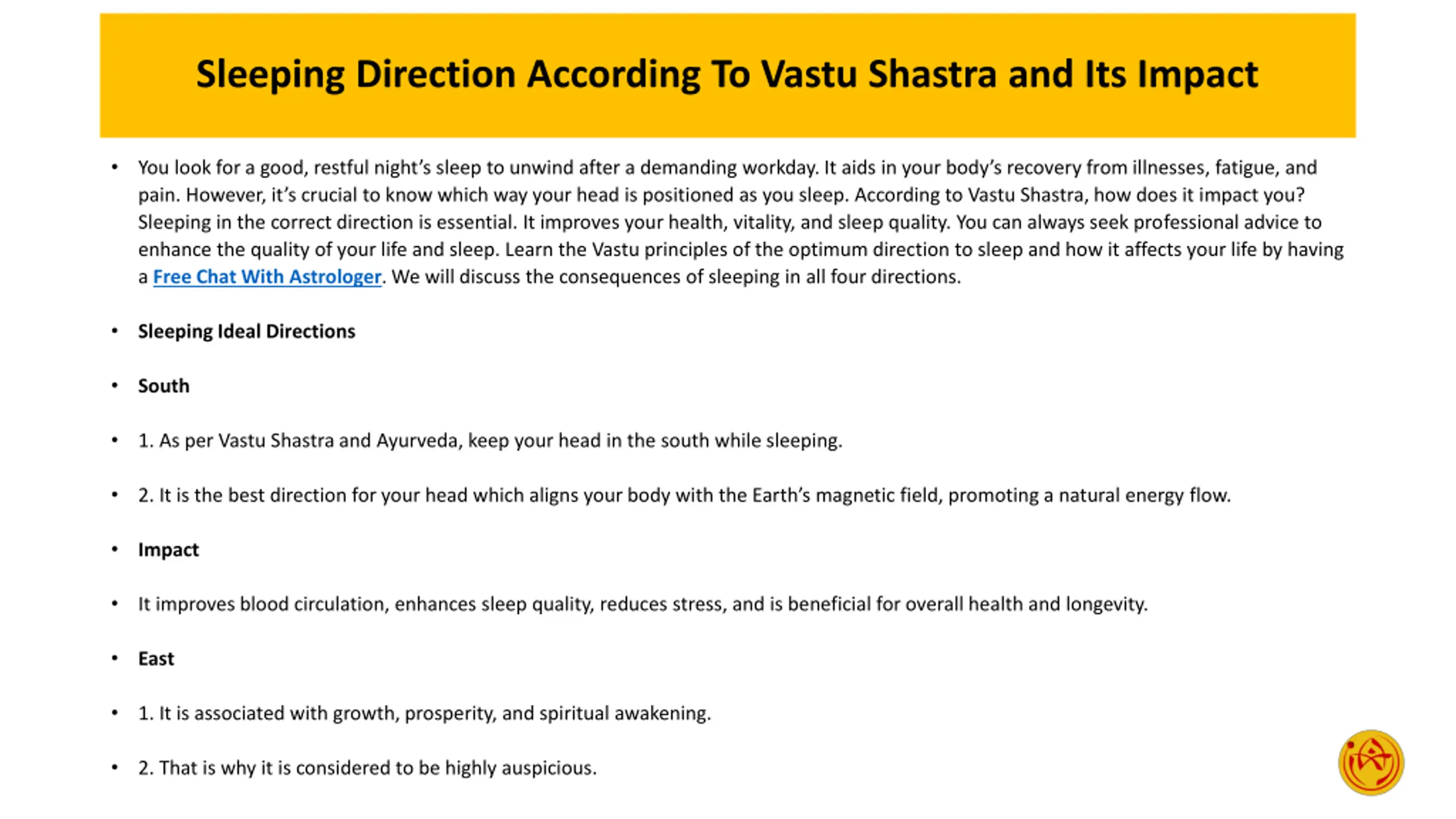 Sleeping Direction According To Vastu Shastra and Its Impact You look for a good, restful night s sleep to unwind after a demanding workday. It aids in your body s recovery from illnesses, fatigue, and pain. However, it s crucial to know which way your head is positioned as you sleep. According to Vastu Shastra, how does it impact you? Sleeping in the correct direction is essential. It improves your health, vitality, and sleep quality. You can always seek professional advice to enhance the quality of your life and sleep. Learn the Vastu principles of the optimum direction to sleep and how it affects your life by having a Free Chat With Astrologer. We will discuss the consequences of sleeping in all four directions. Sleeping Ideal Directions South 1. As per Vastu Shastra and Ayurveda, keep your head in the south while sleeping. 2. It is the best direction for your head which aligns your body with the Earth s magnetic field, promoting a natural energy flow. Impact It improves blood circulation, enhances sleep quality, reduces stress, and is beneficial for overall health and longevity. East 1. It is associated with growth, prosperity, and spiritual awakening. 2. That is why it is considered to be highly auspicious.