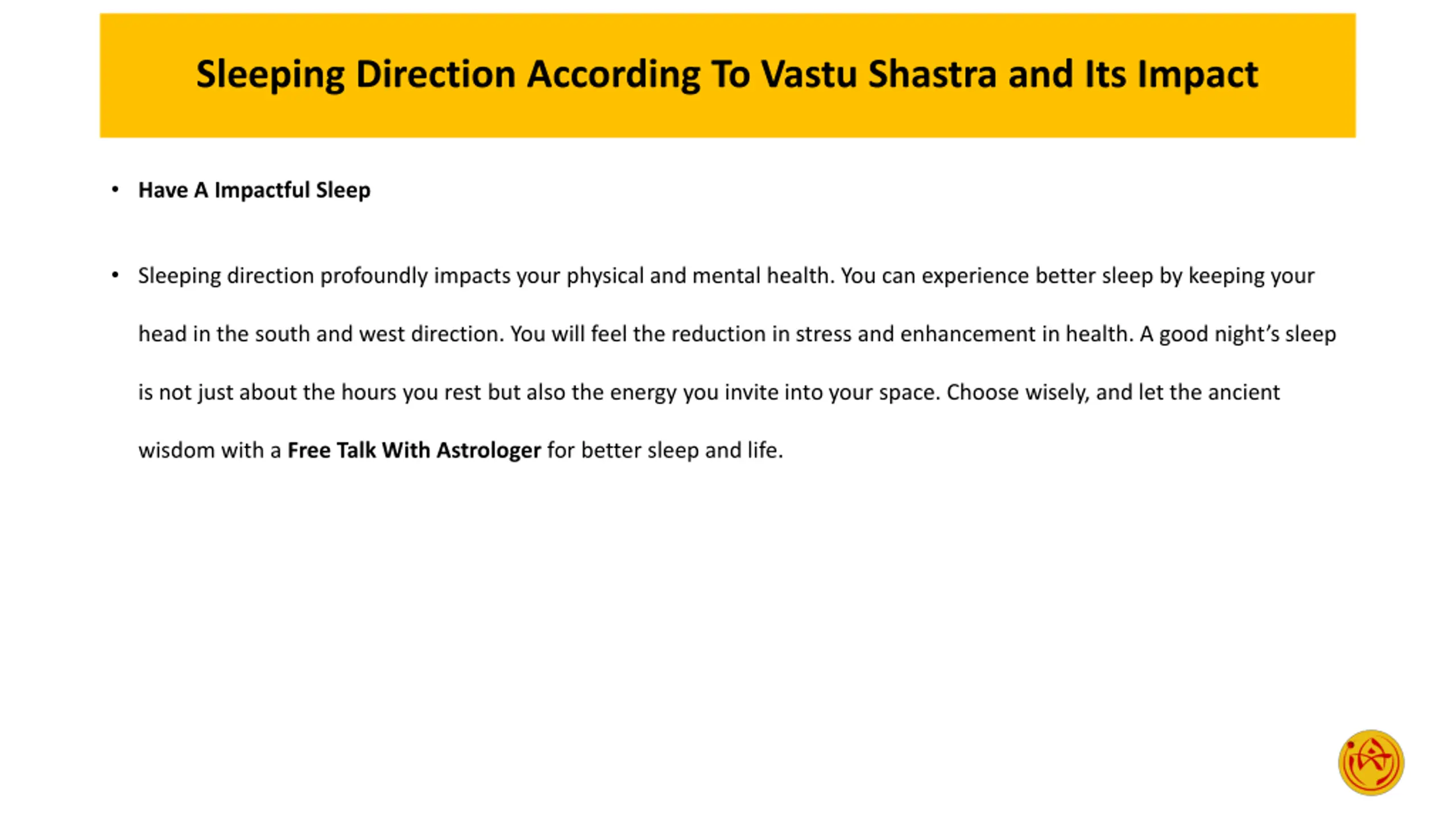 Sleeping Direction According To Vastu Shastra and Its Impact Have A Impactful Sleep Sleeping direction profoundly impacts your physical and mental health. You can experience better sleep by keeping your head in the south and west direction. You will feel the reduction in stress and enhancement in health. A good night s sleep is not just about the hours you rest but also the energy you invite into your space. Choose wisely, and let the ancient wisdom with a Free Talk With Astrologer for better sleep and life.