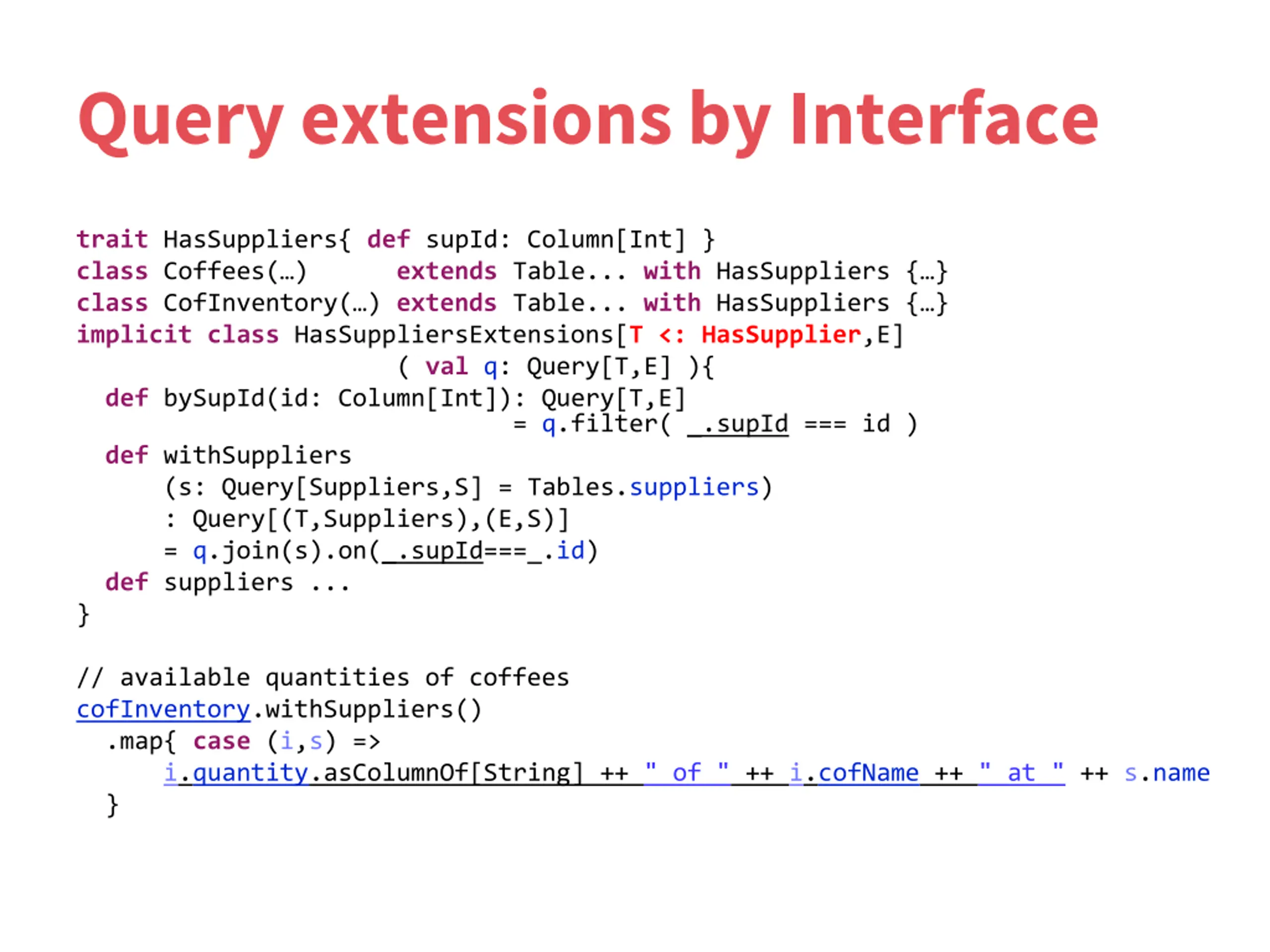 Query extensions by Interface trait HasSuppliers{ def supId: Column[Int] } class Coffees( ) extends Table... with HasSuppliers { } class CofInventory( ) extends Table... with HasSuppliers { } implicitclass HasSuppliersExtensions[T <: HasSupplier,E] ( val q: Query[T,E] ){ def bySupId(id: Column[Int]): Query[T,E] = q.filter( _.supId === id ) def withSuppliers (s: Query[Suppliers,S] = Tables.suppliers) : Query[(T,Suppliers),(E,S)] = q.join(s).on(_.supId===_.id) def suppliers ... } // available quantities of coffees cofInventory.withSuppliers() .map{ case (i,s) => i.quantity.asColumnOf[String] ++ " of " ++ i.cofName ++ " at " ++ s.name }