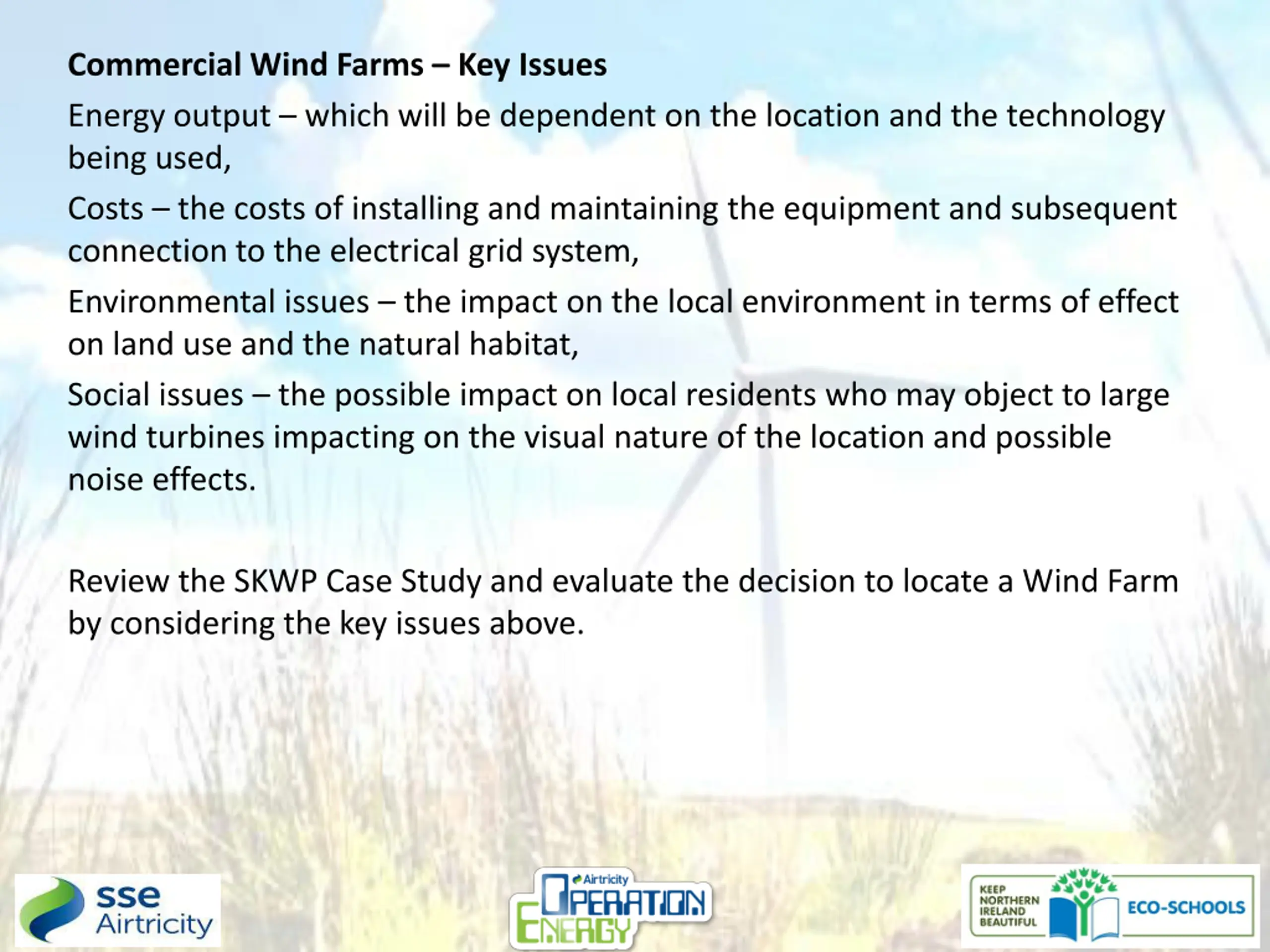 Commercial Wind Farms Key Issues Energy output which will be dependent on the location and the technology being used, Costs the costs of installing and maintaining the equipment and subsequent connection to the electrical grid system, Environmental issues the impact on the local environment in terms of effect on land use and the natural habitat, Social issues the possible impact on local residents who may object to large wind turbines impacting on the visual nature of the location and possible noise effects. Review the SKWP Case Study and evaluate the decision to locate a Wind Farm by considering the key issues above.