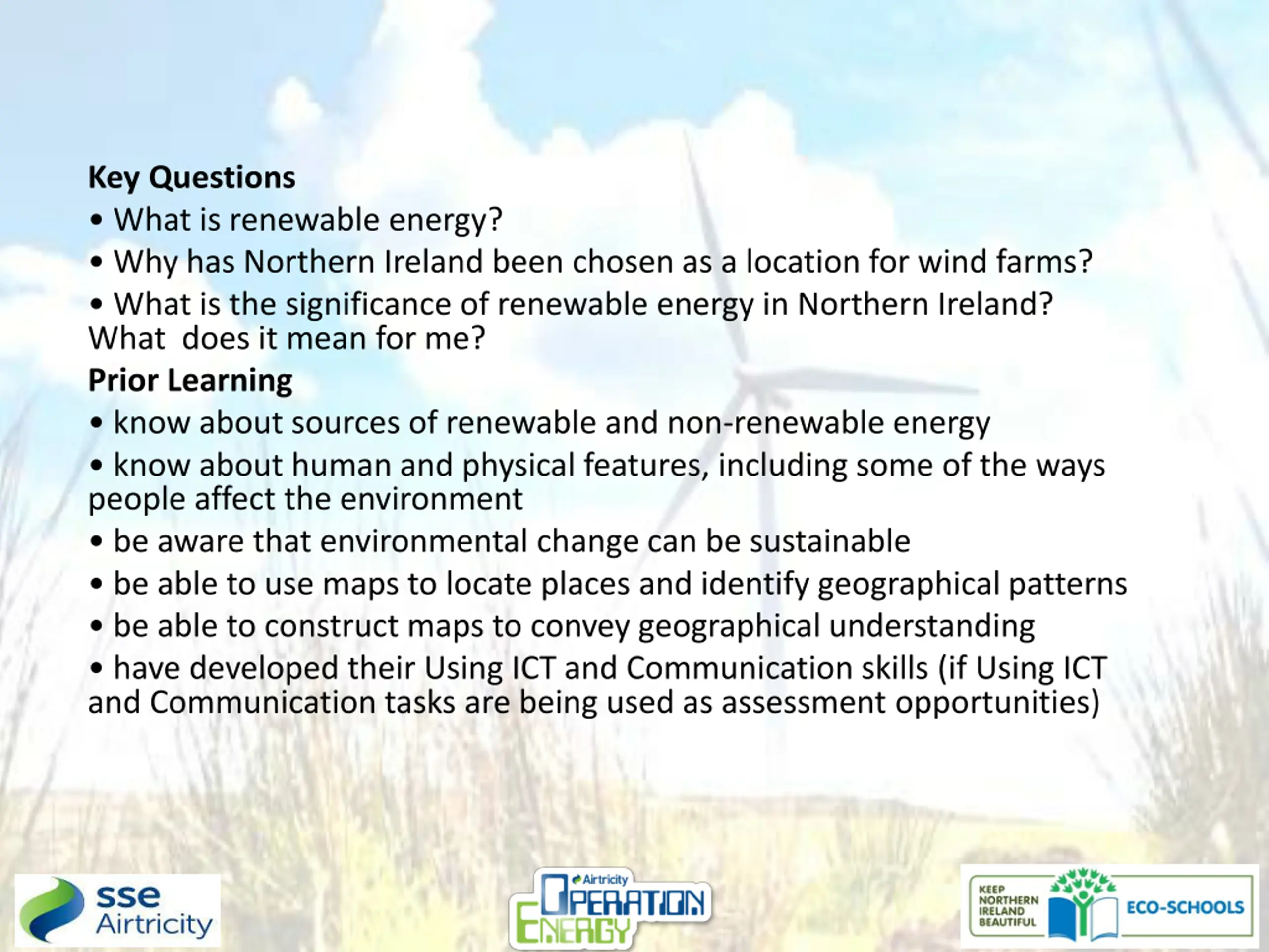 Key Questions What is renewable energy? Why has Northern Ireland been chosen as a location for wind farms? What is the significance of renewable energy in Northern Ireland? What does it mean for me? Prior Learning know about sources of renewable and non-renewable energy know about human and physical features, including some of the ways people affect the environment be aware that environmental change can be sustainable be able to use maps to locate places and identify geographical patterns be able to construct maps to convey geographical understanding have developed their Using ICT and Communication skills (if Using ICT and Communication tasks are being used as assessment opportunities)