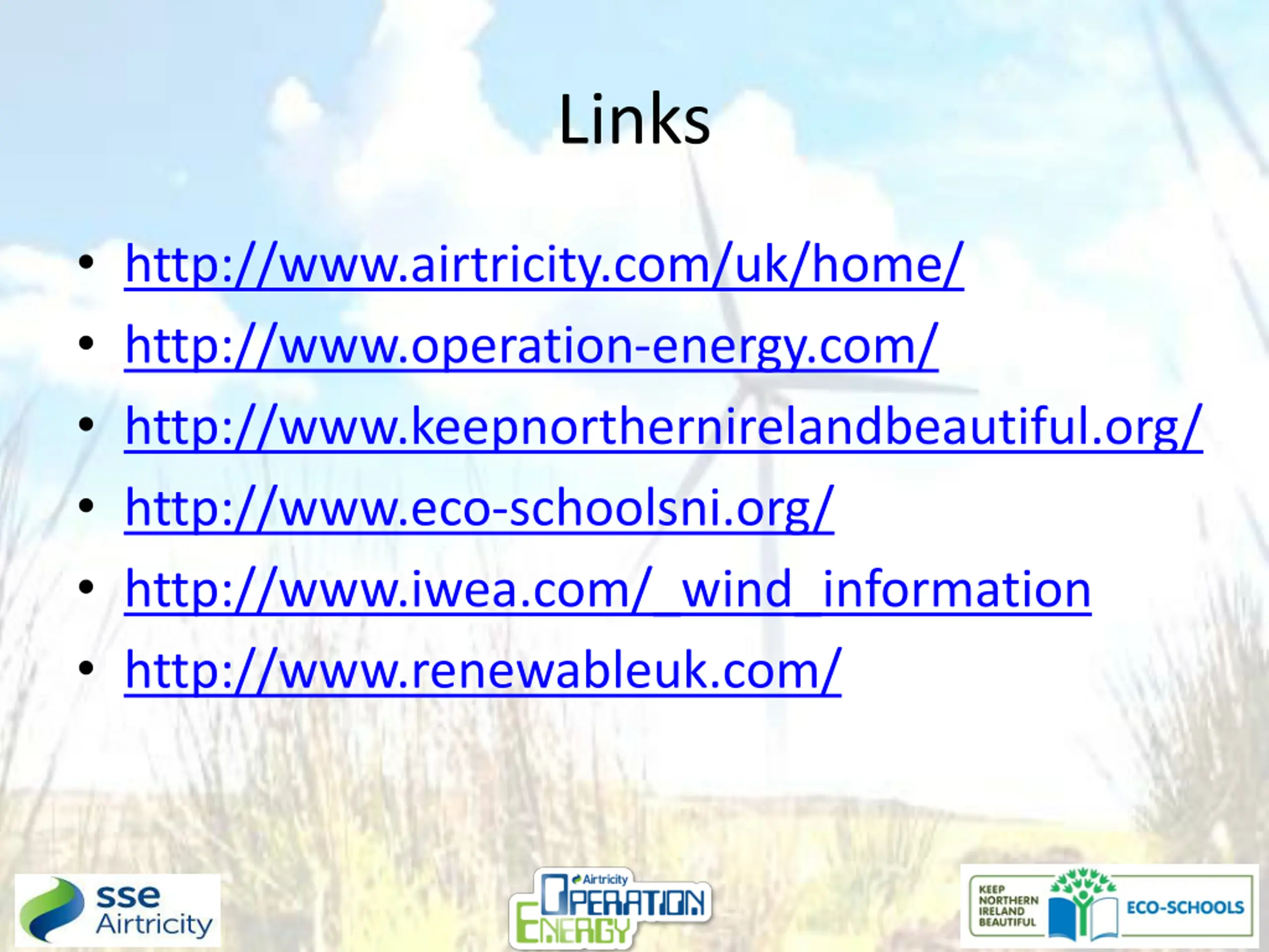 Links http://www.airtricity.com/uk/home/ http://www.operation-energy.com/ http://www.keepnorthernirelandbeautiful.org/ http://www.eco-schoolsni.org/ http://www.iwea.com/_wind_information http://www.renewableuk.com/