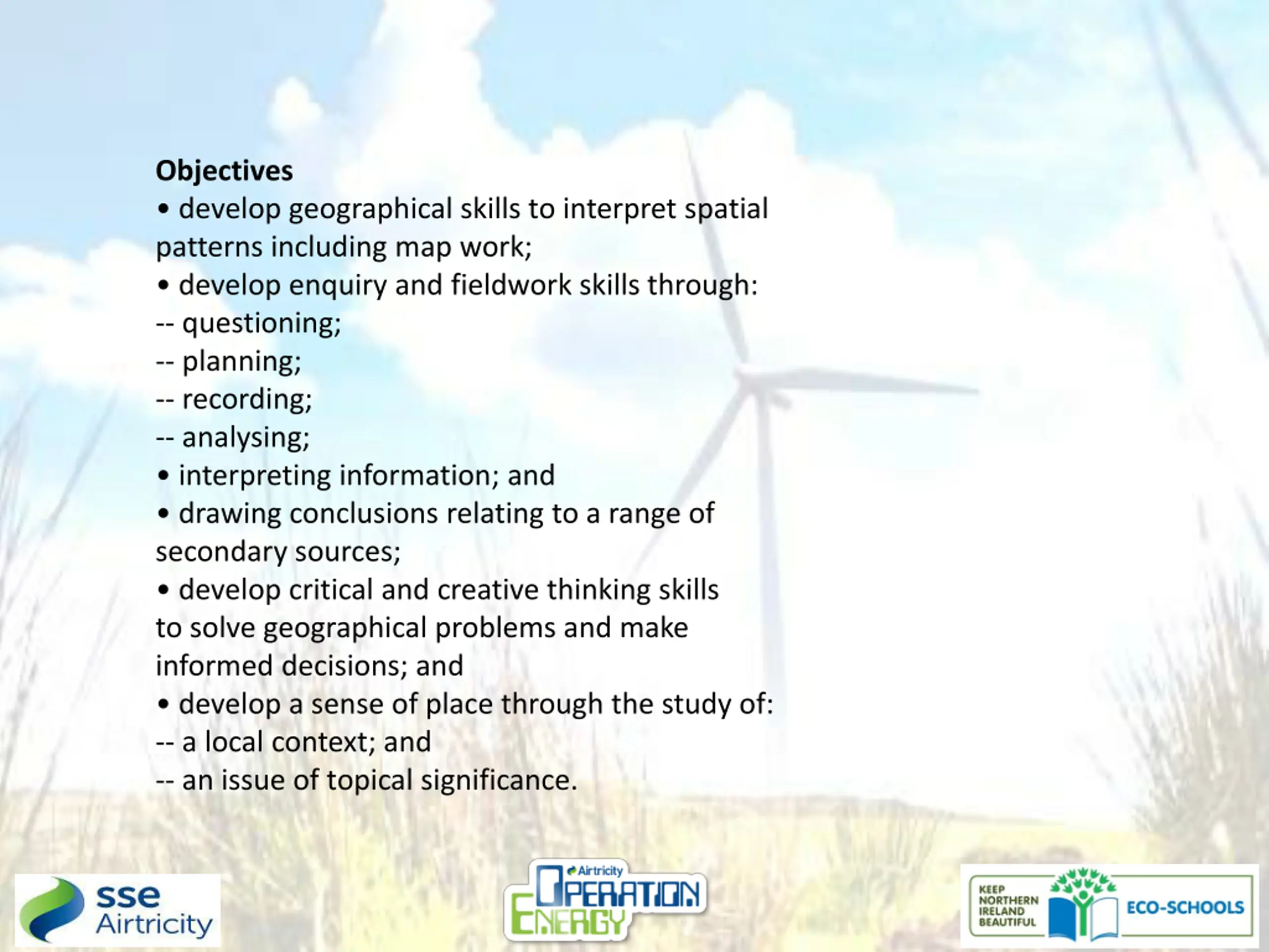 Objectives develop geographical skills to interpret spatial patterns including map work; develop enquiry and fieldwork skills through: -- questioning; -- planning; -- recording; -- analysing; interpreting information; and drawing conclusions relating to a range of secondary sources; develop critical and creative thinking skills to solve geographical problems and make informed decisions; and develop a sense of place through the study of: -- a local context; and -- an issue of topical significance.