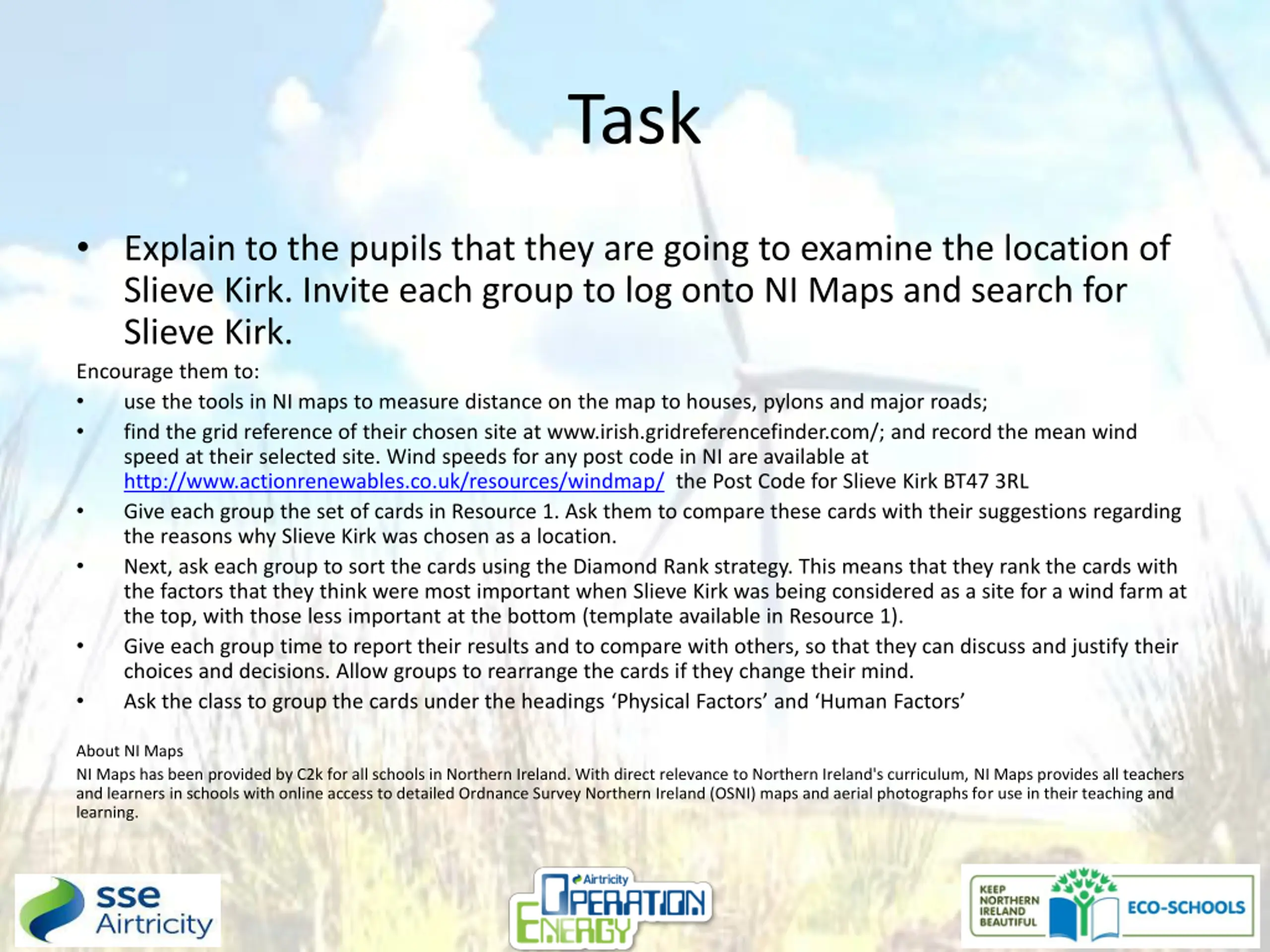 Task Explain to the pupils that they are going to examine the location of Slieve Kirk. Invite each group to log onto NI Maps and search for Slieve Kirk. Encourage them to: use the tools in NI maps to measure distance on the map to houses, pylons and major roads; find the grid reference of their chosen site at www.irish.gridreferencefinder.com/; and record the mean wind speed at their selected site. Wind speeds for any post code in NI are available at http://www.actionrenewables.co.uk/resources/windmap/ the Post Code for Slieve Kirk BT47 3RL Give each group the set of cards in Resource 1. Ask them to compare these cards with their suggestions regarding the reasons why Slieve Kirk was chosen as a location. Next, ask each group to sort the cards using the Diamond Rank strategy. This means that they rank the cards with the factors that they think were most important when Slieve Kirk was being considered as a site for a wind farm at the top, with those less important at the bottom (template available in Resource 1). Give each group time to report their results and to compare with others, so that they can discuss and justify their choices and decisions. Allow groups to rearrange the cards if they change their mind. Ask the class to group the cards under the headings Physical Factors and Human Factors About NI Maps NI Maps has been provided by C2k for all schools in Northern Ireland. With direct relevance to Northern Ireland's curriculum, NI Maps provides all teachers and learners in schools with online access to detailed Ordnance Survey Northern Ireland (OSNI) maps and aerial photographs for use in their teaching and learning.