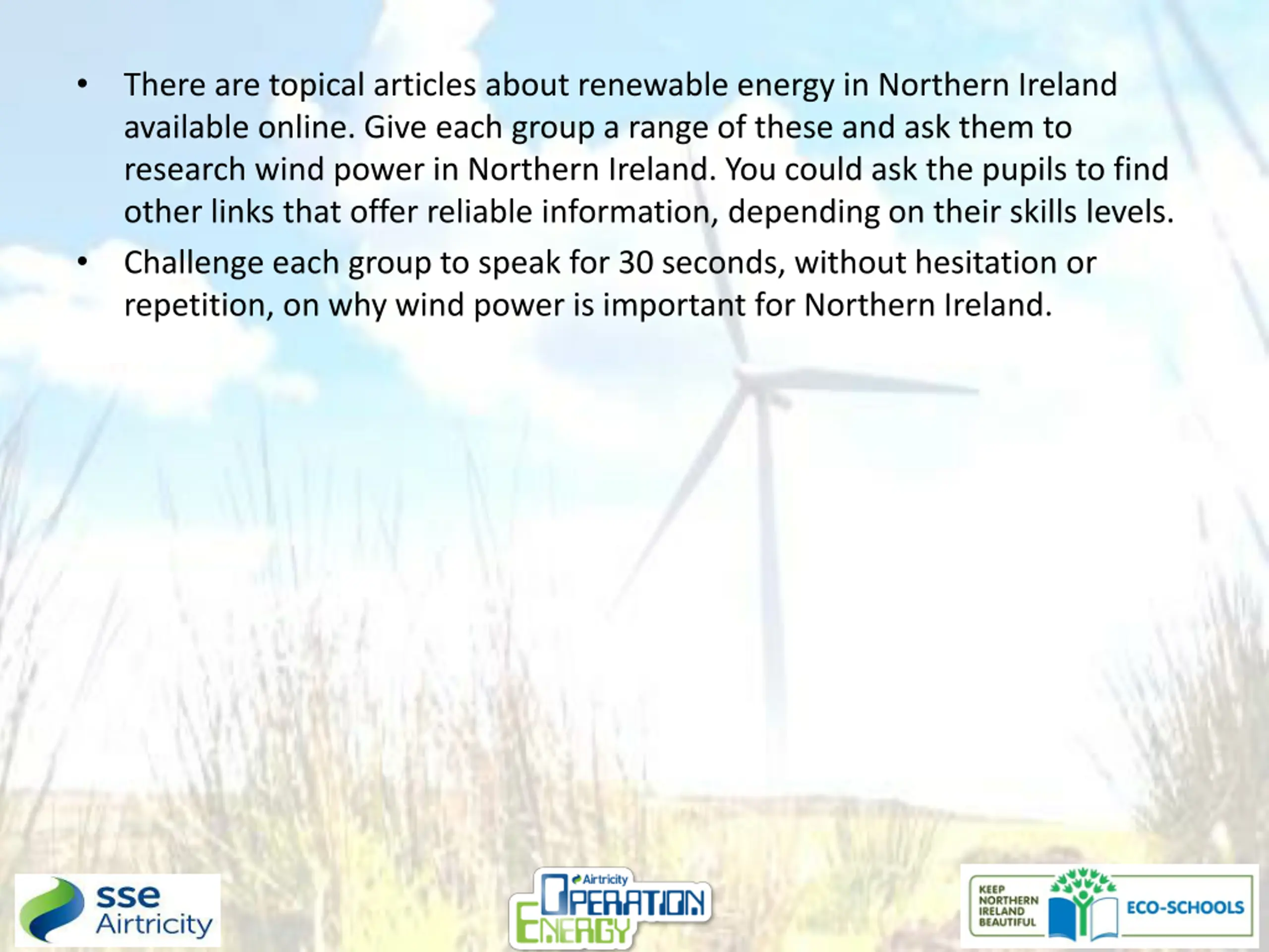 There are topical articles about renewable energy in Northern Ireland available online. Give each group a range of these and ask them to research wind power in Northern Ireland. You could ask the pupils to find other links that offer reliable information, depending on their skills levels. Challenge each group to speak for 30 seconds, without hesitation or repetition, on why wind power is important for Northern Ireland.