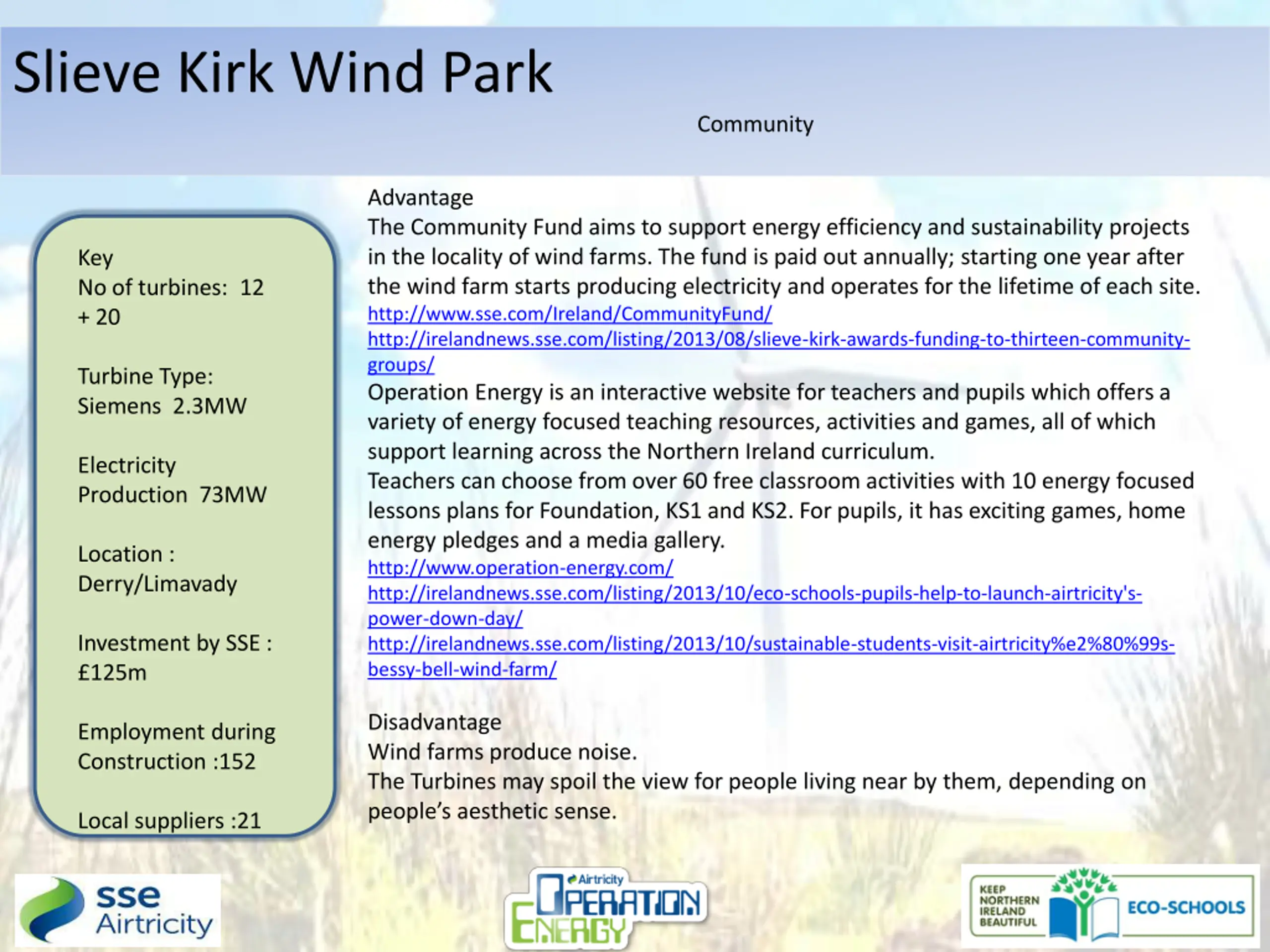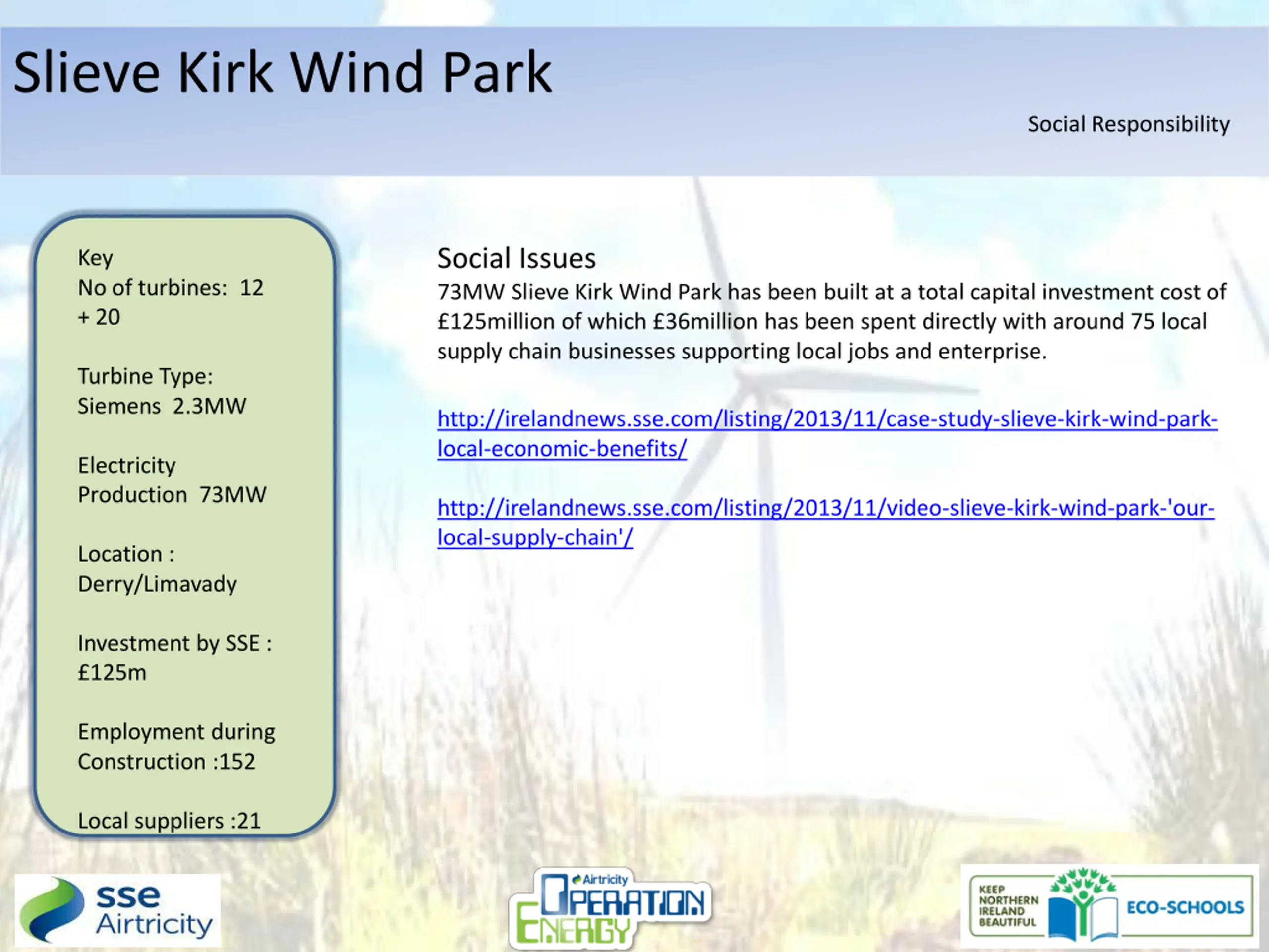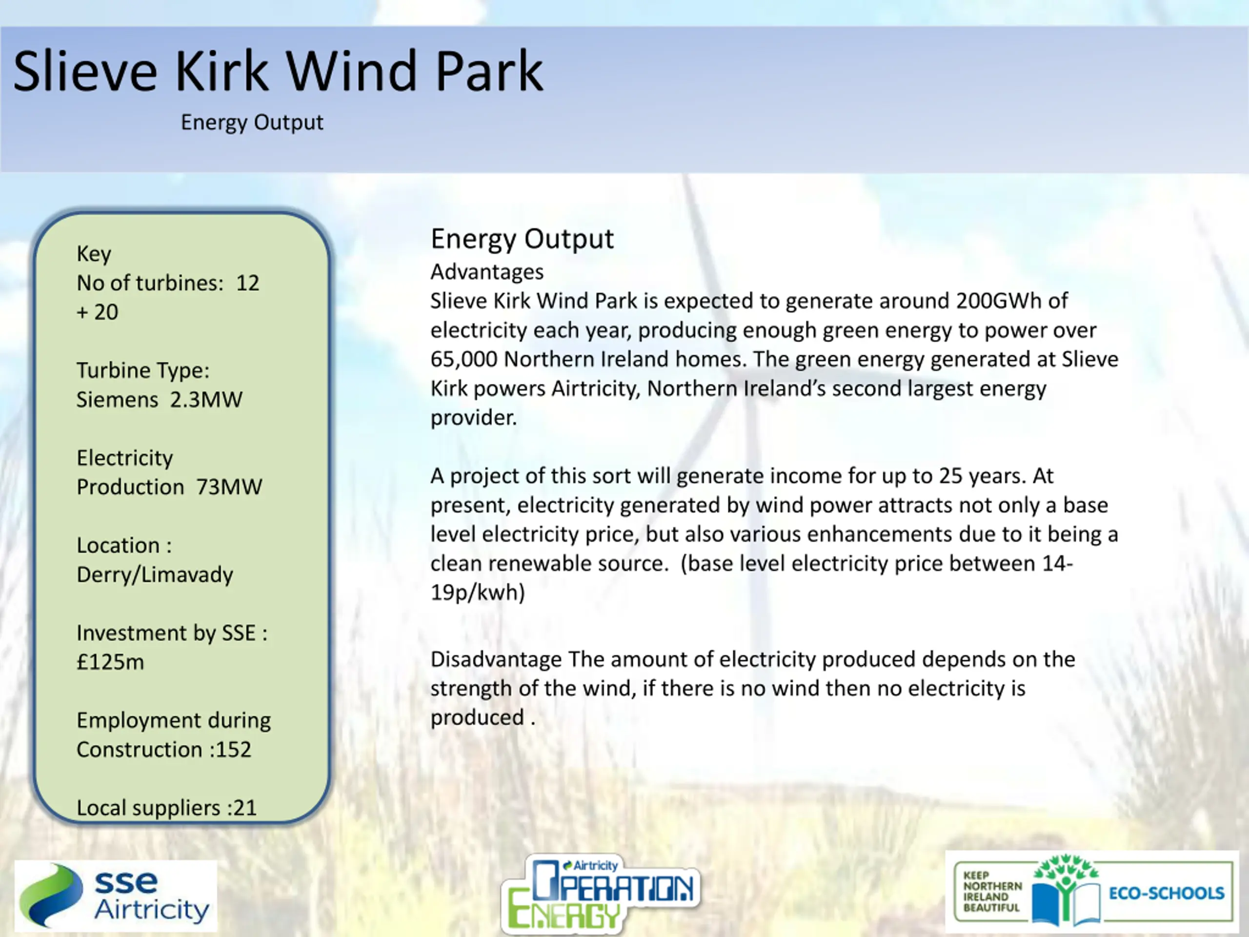 Slieve Kirk Wind Park Energy Output Energy Output Advantages Slieve Kirk Wind Park is expected to generate around 200GWh of electricity each year, producing enough green energy to power over 65,000 Northern Ireland homes. The green energy generated at Slieve Kirk powers Airtricity, Northern Ireland s second largest energy provider. Key No of turbines: 12 + 20 Turbine Type: Siemens 2.3MW Electricity Production 73MW A project of this sort will generate income for up to 25 years. At present, electricity generated by wind power attracts not only a base level electricity price, but also various enhancements due to it being a clean renewable source. (base level electricity price between 14- 19p/kwh) Location : Derry/Limavady Investment by SSE : 125m Disadvantage The amount of electricity produced depends on the strength of the wind, if there is no wind then no electricity is produced . Employment during Construction :152 Local suppliers :21