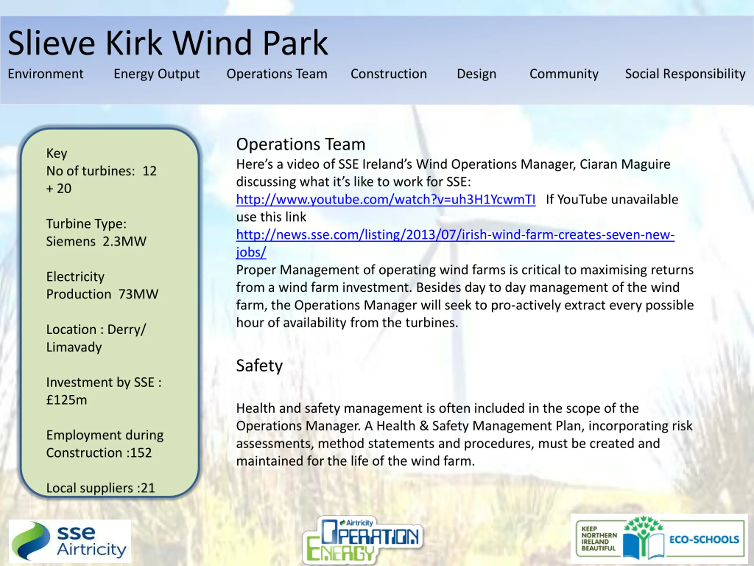 Slieve Kirk Wind Park Environment Energy Output Operations Team Construction Design Community Social Responsibility Operations Team Here s a video of SSE Ireland s Wind Operations Manager, Ciaran Maguire discussing what it s like to work for SSE: http://www.youtube.com/watch?v=uh3H1YcwmTI If YouTube unavailable use this link http://news.sse.com/listing/2013/07/irish-wind-farm-creates-seven-new- jobs/ Proper Management of operating wind farms is critical to maximising returns from a wind farm investment. Besides day to day management of the wind farm, the Operations Manager will seek to pro-actively extract every possible hour of availability from the turbines. Key No of turbines: 12 + 20 Turbine Type: Siemens 2.3MW Electricity Production 73MW Location : Derry/ Limavady Safety Investment by SSE : 125m Health and safety management is often included in the scope of the Operations Manager. A Health & Safety Management Plan, incorporating risk assessments, method statements and procedures, must be created and maintained for the life of the wind farm. Employment during Construction :152 Local suppliers :21