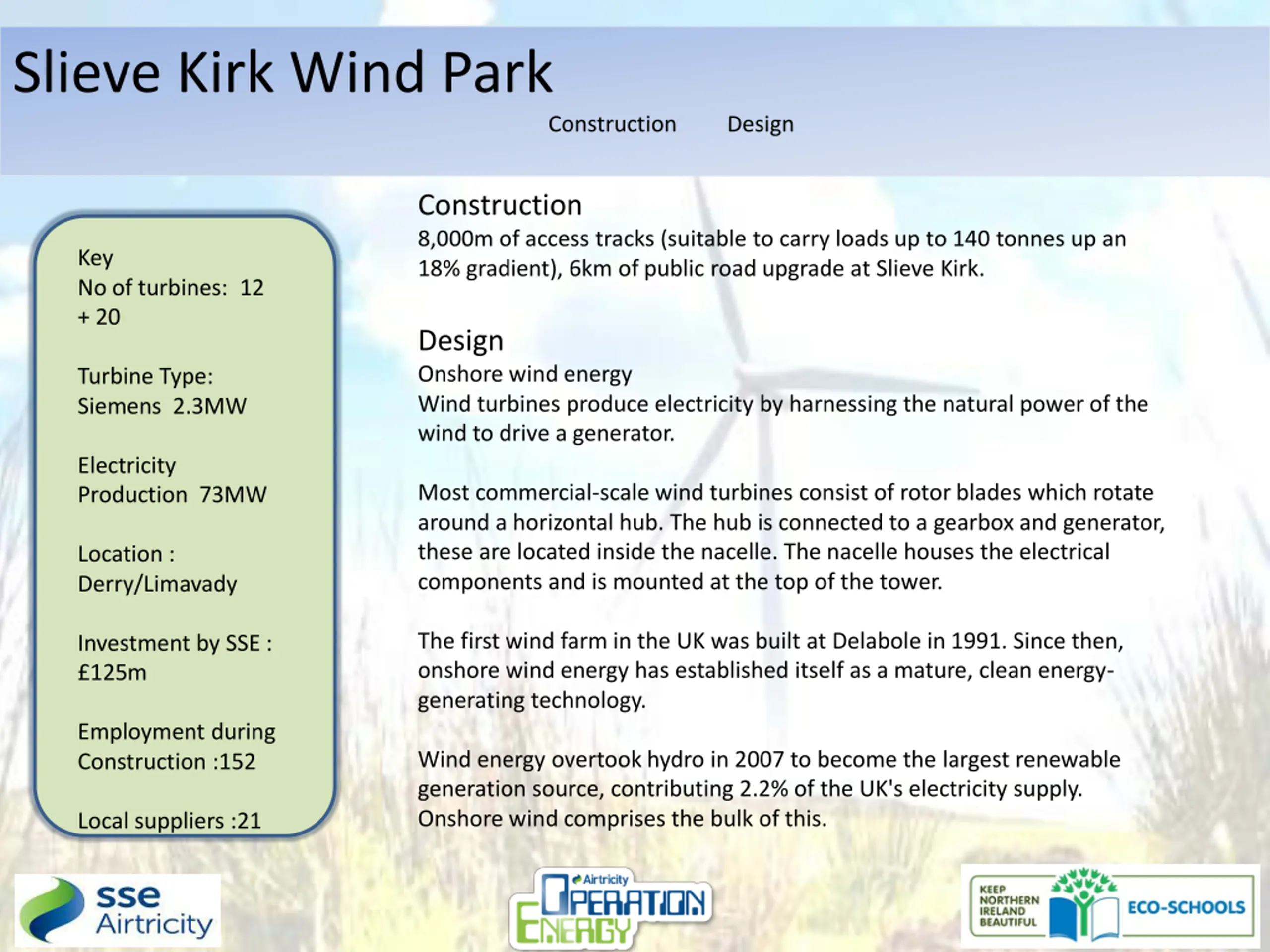 Slieve Kirk Wind Park Environment Energy Output Operations Team Construction Design Community Social Responsibility Key No of turbines: 12 + 20 Location Slieve Kirk Wind Park is Northern Ireland s first and largest grouped wind farm development. The 125million generation site has been delivered through the development of the original 27MW Slieve Kirk wind farm near Ardmore with a 46MW expansion of capacity developed at Glenconway Hill, Glenconway is located on the Baranailt Road (B69) to the south of Limavady. The wind park was developed by SSE Renewables, Northern Ireland s No.1 renewable energy developer. Turbine Type: Siemens 2.3MW Electricity Production 73MW Location: Derry/Limavady Advantages open areas of land heavily exposed to the wind proximity to a 33kv electrical supply no special environmental classification no special restrictions on use of the land Investment by SSE : 125m Employment during Construction :152 Disadvantages The location is open countryside and many people feel that the countryside should be left untouched. Local suppliers :21