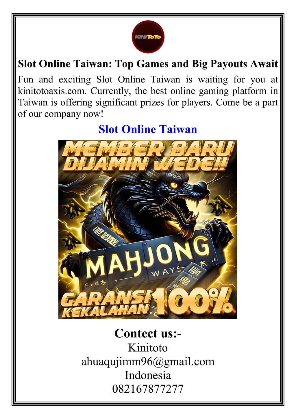 Slot Online Taiwan: Top Games and Big Payouts Await Fun and exciting Slot Online Taiwan is waiting for you at kinitotoaxis.com. Currently, the best online gaming platform in Taiwan is offering significant prizes for players. Come be a part of our company now! Slot Online Taiwan Contect us:- Kinitoto ahuaqujimm96@gmail.com Indonesia 082167877277