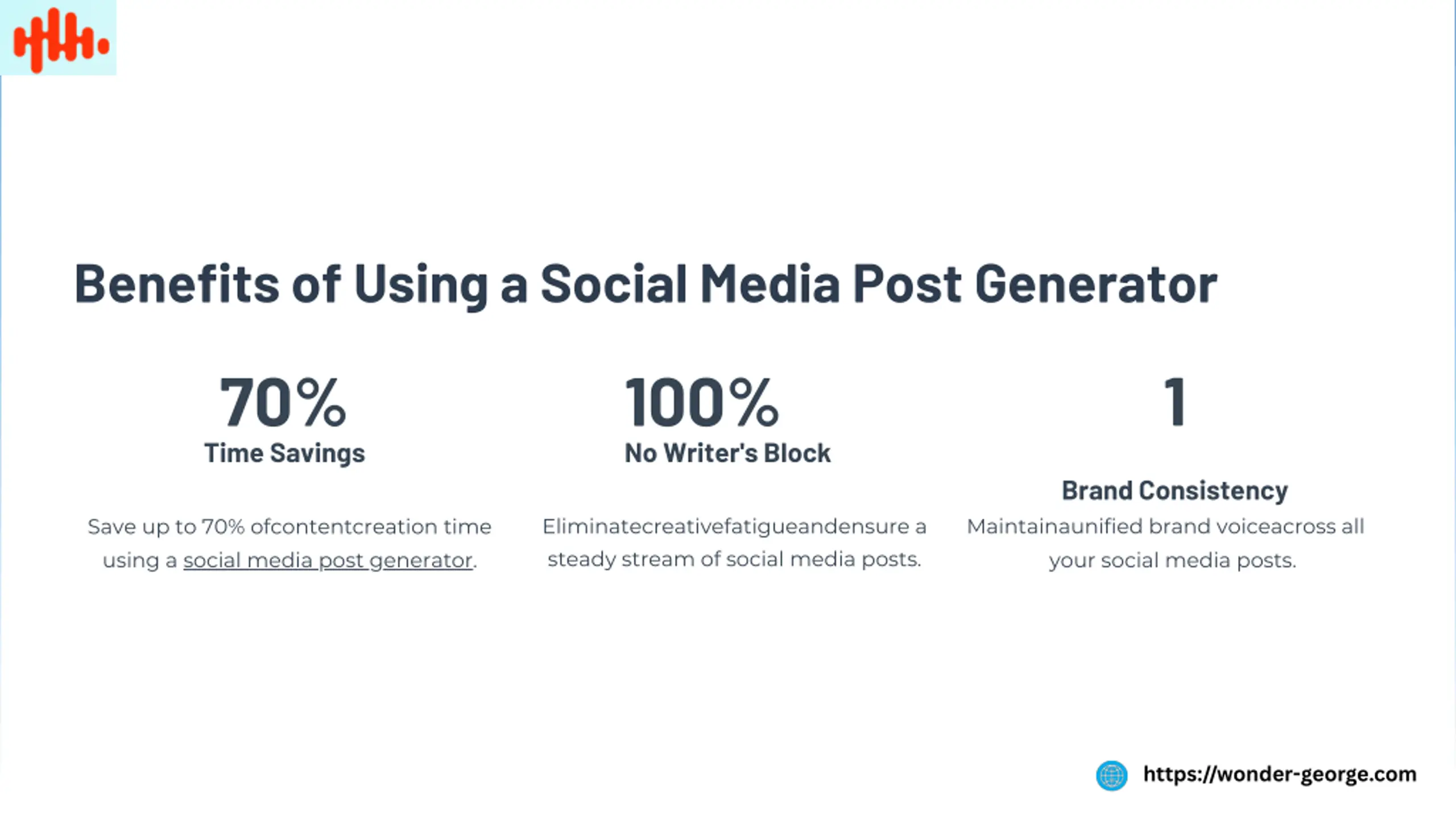 Benefits of Using a Social Media Post Generator 1 70% Time Savings 100% No Writer's Block Brand Consistency Maintainaunified brand voiceacross all your social media posts. Eliminatecreativefatigueandensure a steadystreamofsocialmediaposts. Save up to 70% ofcontentcreation time using a social media post generator. https://wonder-george.com