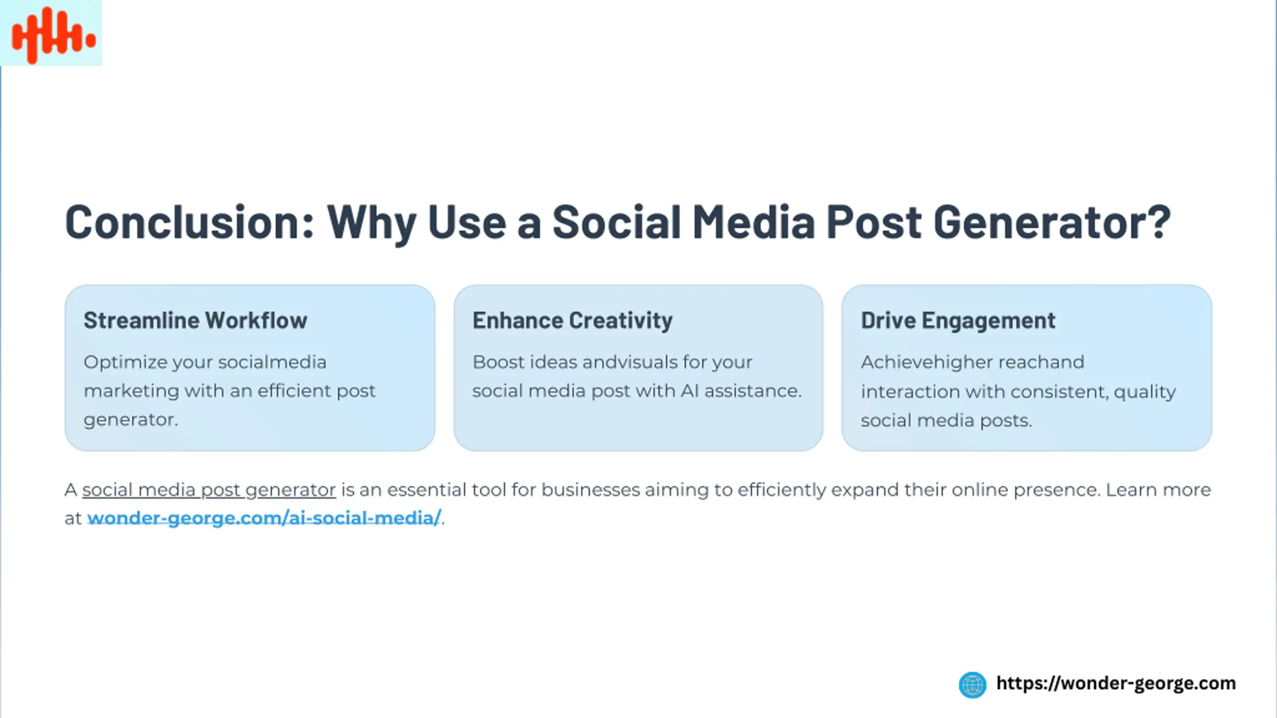 Conclusion: Why Use a Social Media Post Generator? StreamlineWorkflow EnhanceCreativity DriveEngagement Optimize your socialmedia marketing with an efficient post generator. Boost ideas andvisuals for your social media post with AI assistance. Achievehigher reachand interaction with consistent, quality social media posts. A social media post generator is an essential tool for businesses aiming to efficiently expand their online presence. Learn more at wonder-george.com/ai-social-media/. https://wonder-george.com