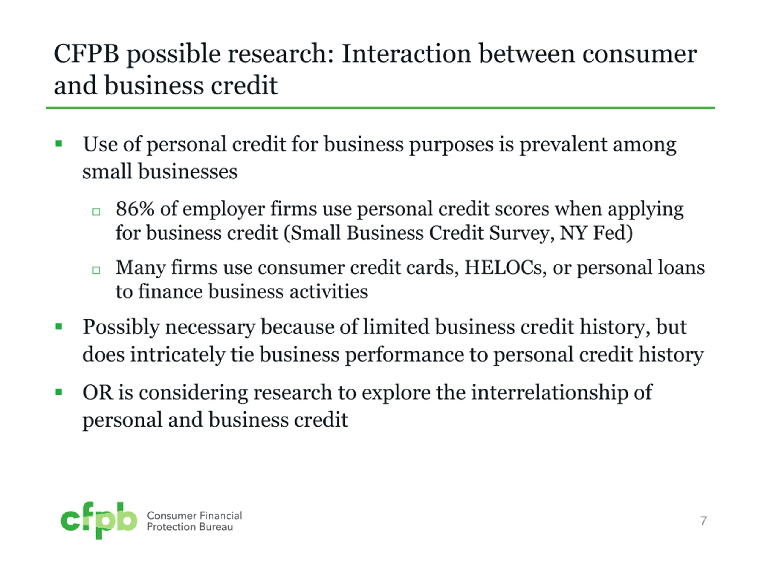 CFPB possible research: Interaction between consumer and business credit Use of personal credit for business purposes is prevalent among small businesses 86% of employer firms use personal credit scores when applying for business credit (Small Business Credit Survey, NY Fed) Many firms use consumer credit cards, HELOCs, or personal loans to finance business activities Possibly necessary because of limited business credit history, but does intricately tie business performance to personal credit history OR is considering research to explore the interrelationship of personal and business credit 7