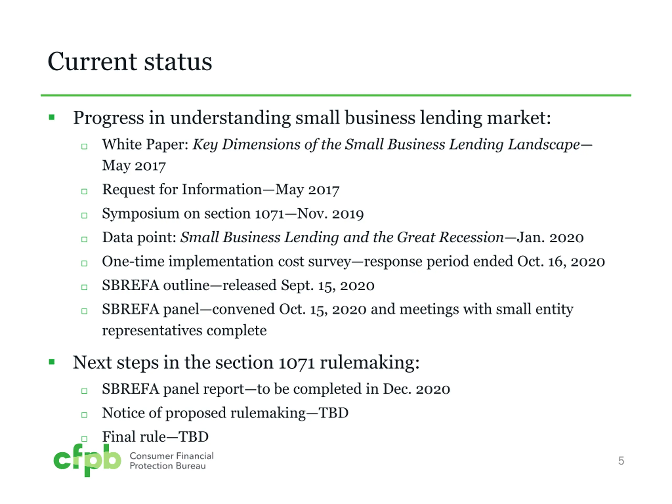 Current status Progress in understanding small business lending market: White Paper: Key Dimensions of the Small Business Lending Landscape May 2017 Request for Information May 2017 Symposium on section 1071 Nov. 2019 Data point: Small Business Lending and the Great Recession Jan. 2020 One-time implementation cost survey response period ended Oct. 16, 2020 SBREFA outline released Sept. 15, 2020 SBREFA panel convened Oct. 15, 2020 and meetings with small entity representatives complete Next steps in the section 1071 rulemaking: SBREFA panel report to be completed in Dec. 2020 Notice of proposed rulemaking TBD Final rule TBD 5
