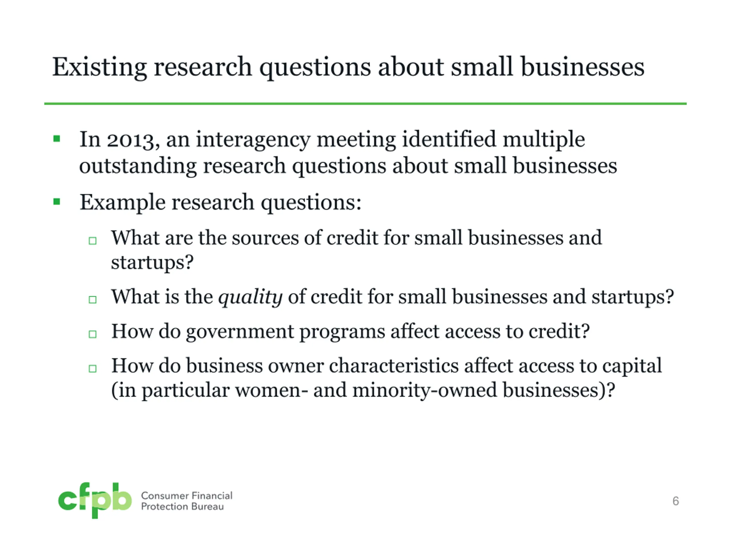 Existing research questions about small businesses In 2013, an interagency meeting identified multiple outstanding research questions about small businesses Example research questions: What are the sources of credit for small businesses and startups? What is the quality of credit for small businesses and startups? How do government programs affect access to credit? How do business owner characteristics affect access to capital (in particular women- and minority-owned businesses)? 6
