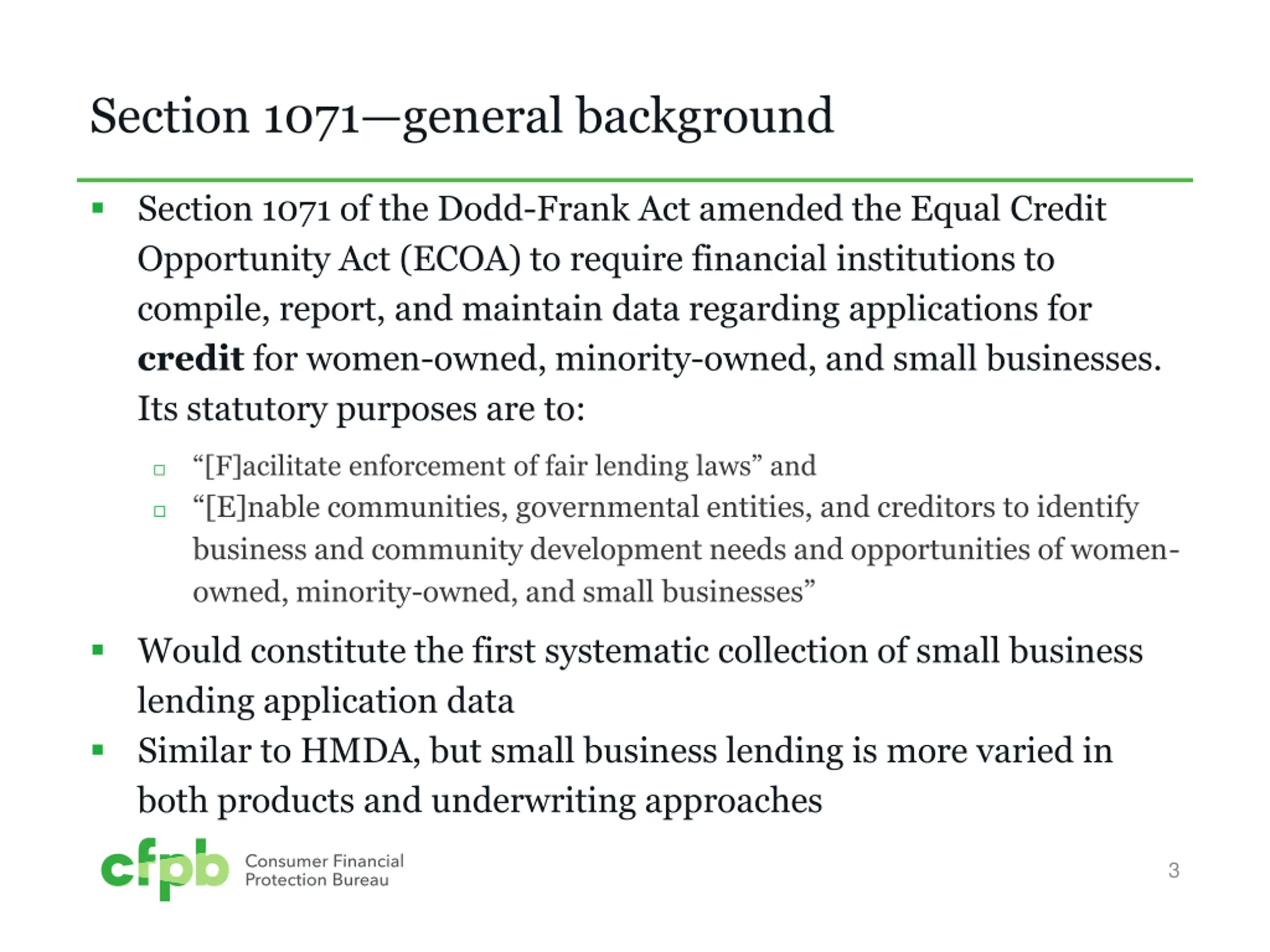 Section 1071general background Section 1071 of the Dodd-Frank Act amended the Equal Credit Opportunity Act (ECOA) to require financial institutions to compile, report, and maintain data regarding applications for credit for women-owned, minority-owned, and small businesses. Its statutory purposes are to: [F]acilitate enforcement of fair lending laws and [E]nable communities, governmental entities, and creditors to identify business and community development needs and opportunities of women- owned, minority-owned, and small businesses Would constitute the first systematic collection of small business lending application data Similar to HMDA, but small business lending is more varied in both products and underwriting approaches 3