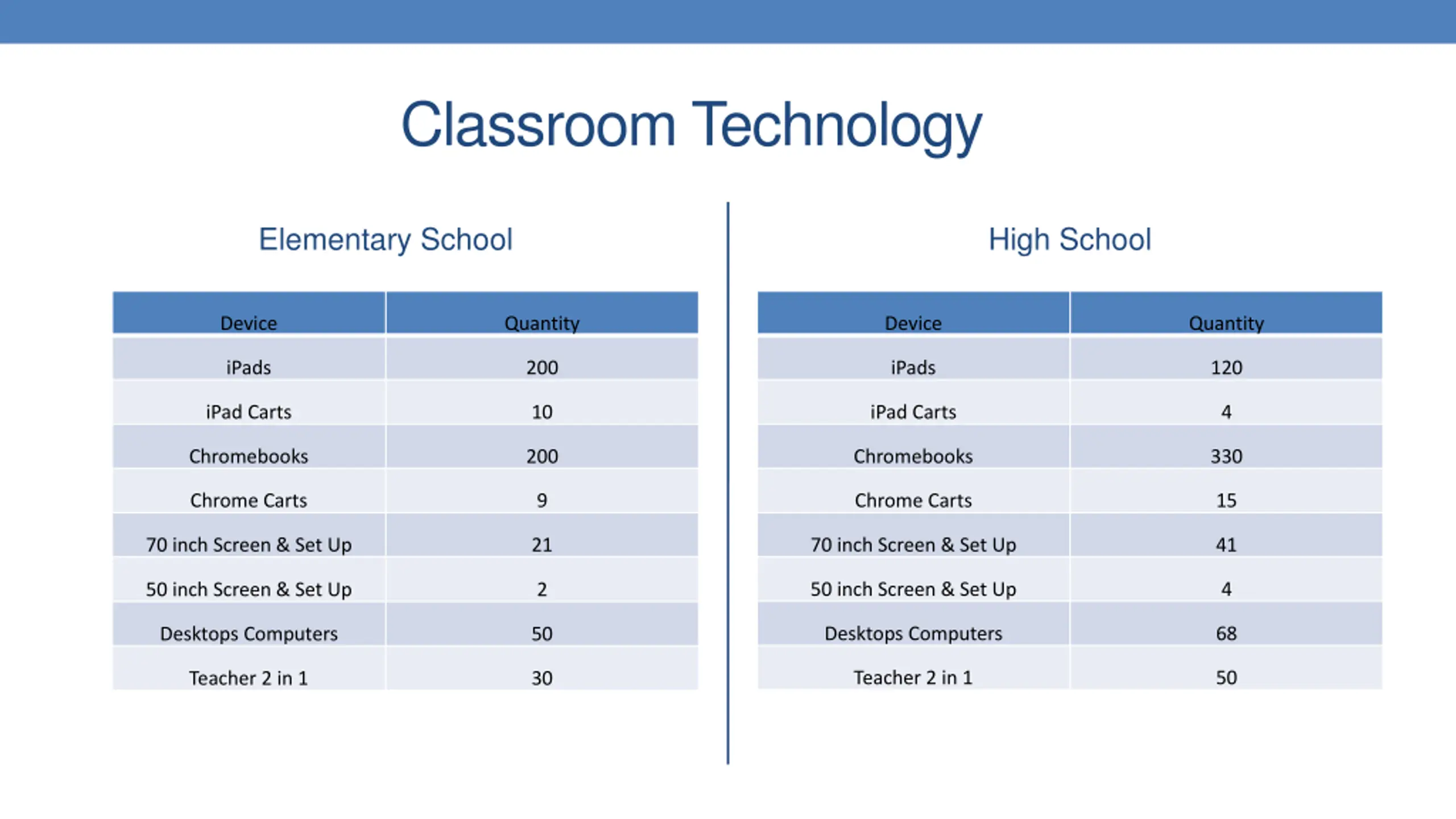 Classroom Technology Elementary School High School Device Quantity Device Quantity iPads 200 iPads 120 iPad Carts 10 iPad Carts 4 Chromebooks 200 Chromebooks 330 Chrome Carts 9 Chrome Carts 15 70 inch Screen & Set Up 21 70 inch Screen & Set Up 41 50 inch Screen & Set Up 4 50 inch Screen & Set Up 2 Desktops Computers 68 Desktops Computers 50 Teacher 2 in 1 50 Teacher 2 in 1 30