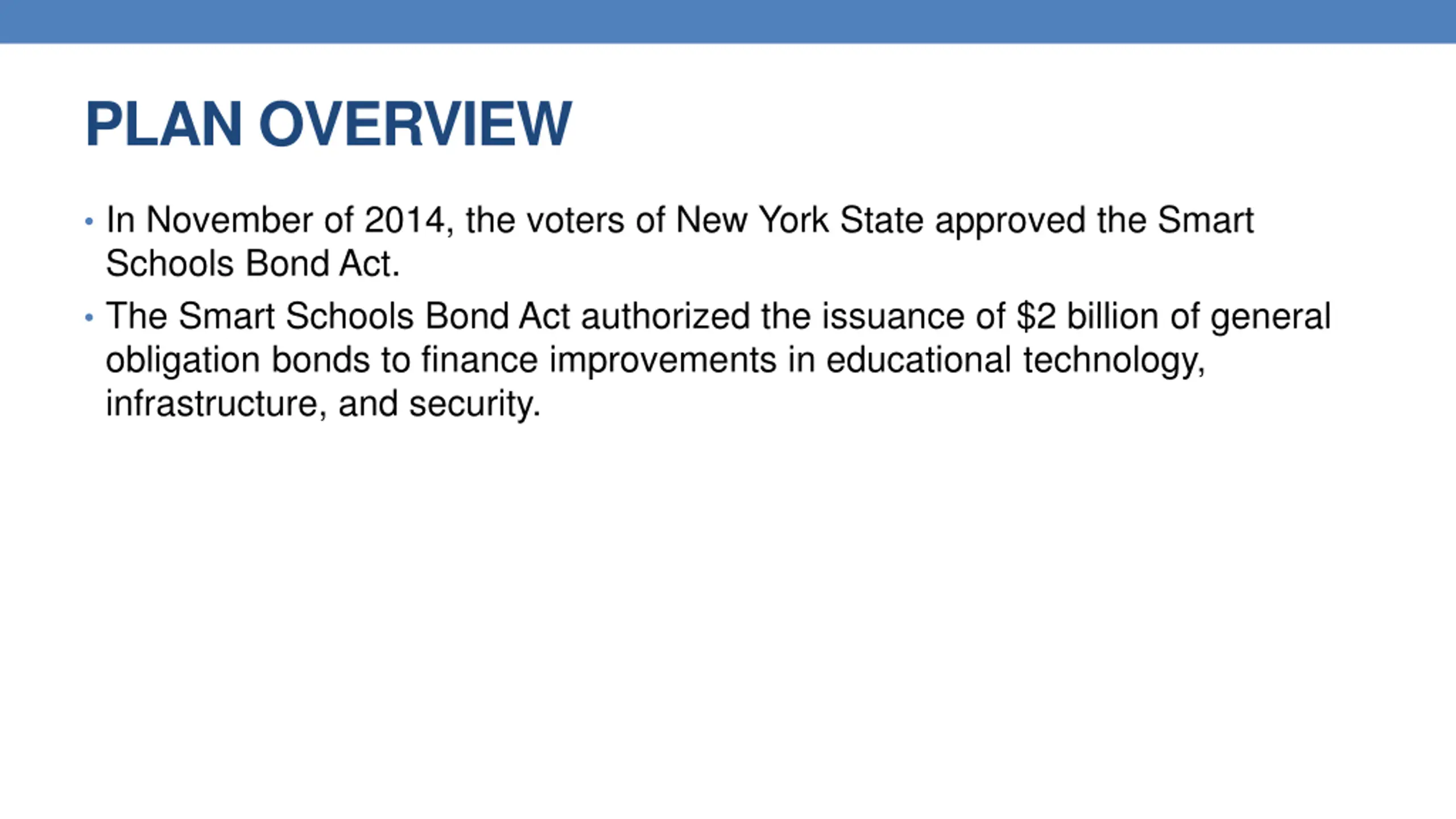 PLAN OVERVIEW In November of 2014, the voters of New York State approved the Smart Schools Bond Act. The Smart Schools Bond Act authorized the issuance of $2 billion of general obligation bonds to finance improvements in educational technology, infrastructure, and security.