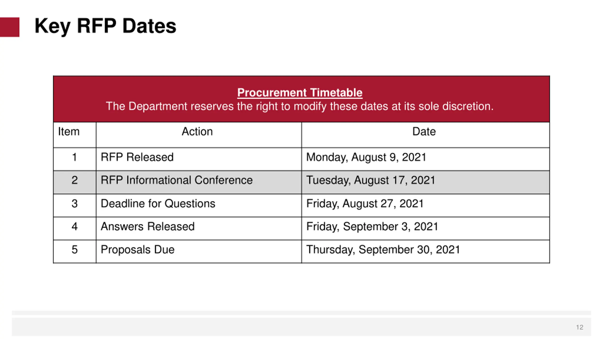 Key RFP Dates Procurement Timetable The Department reserves the right to modify these dates at its sole discretion. Item Action Date 1 RFP Released Monday, August 9, 2021 2 RFP Informational Conference Tuesday, August 17, 2021 3 Deadline for Questions Friday, August 27, 2021 4 Answers Released Friday, September 3, 2021 5 Proposals Due Thursday, September 30, 2021 12