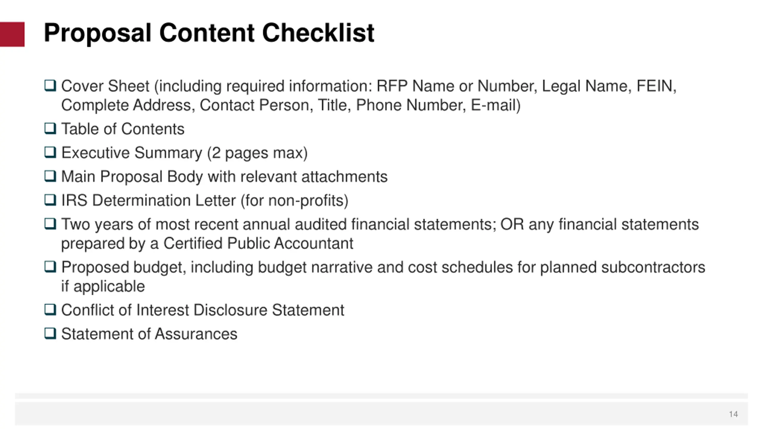 Proposal Content Checklist Cover Sheet (including required information: RFP Name or Number, Legal Name, FEIN, Complete Address, Contact Person, Title, Phone Number, E-mail) Table of Contents Executive Summary (2 pages max) Main Proposal Body with relevant attachments IRS Determination Letter (for non-profits) Two years of most recent annual audited financial statements; OR any financial statements prepared by a Certified Public Accountant Proposed budget, including budget narrative and cost schedules for planned subcontractors if applicable Conflict of Interest Disclosure Statement Statement of Assurances 14