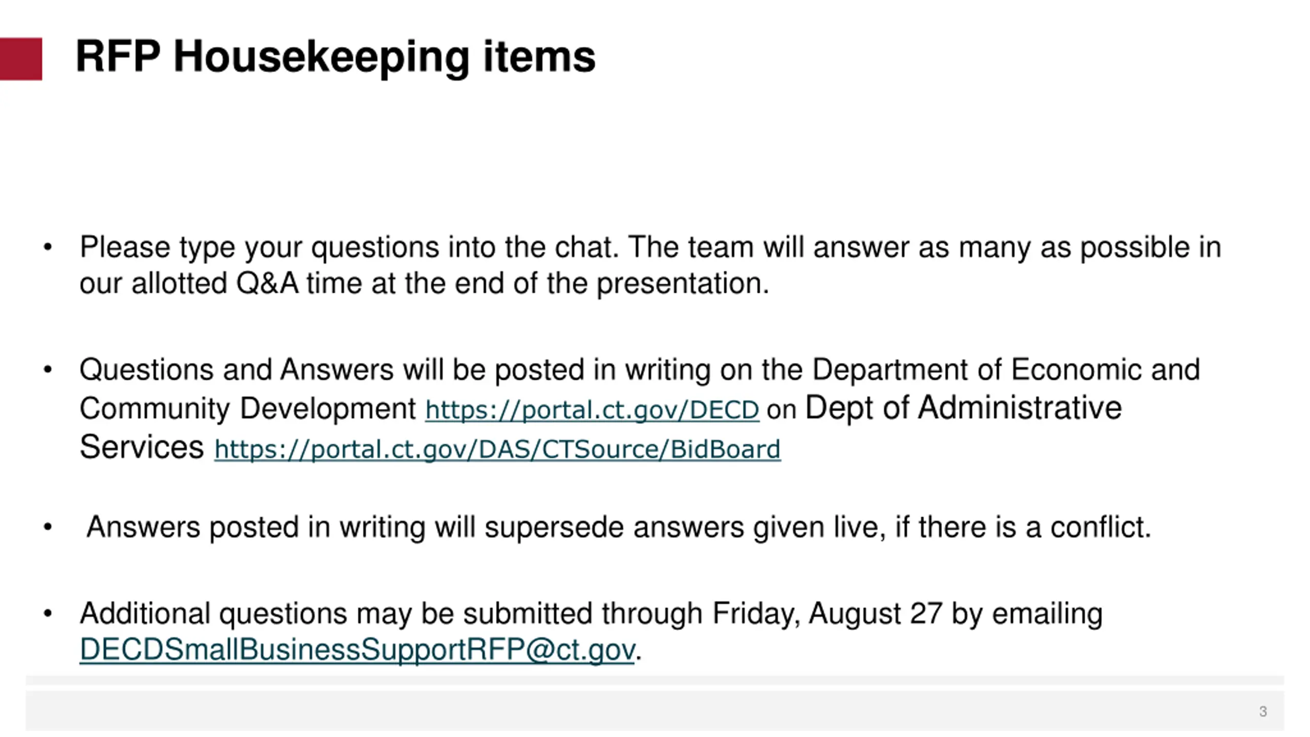 RFP Housekeeping items Please type your questions into the chat. The team will answer as many as possible in our allotted Q&A time at the end of the presentation. Questions and Answers will be posted in writing on the Department of Economic and Community Development https://portal.ct.gov/DECD on Dept of Administrative Services https://portal.ct.gov/DAS/CTSource/BidBoard Answers posted in writing will supersede answers given live, if there is a conflict. Additional questions may be submitted through Friday, August 27 by emailing DECDSmallBusinessSupportRFP@ct.gov. 3