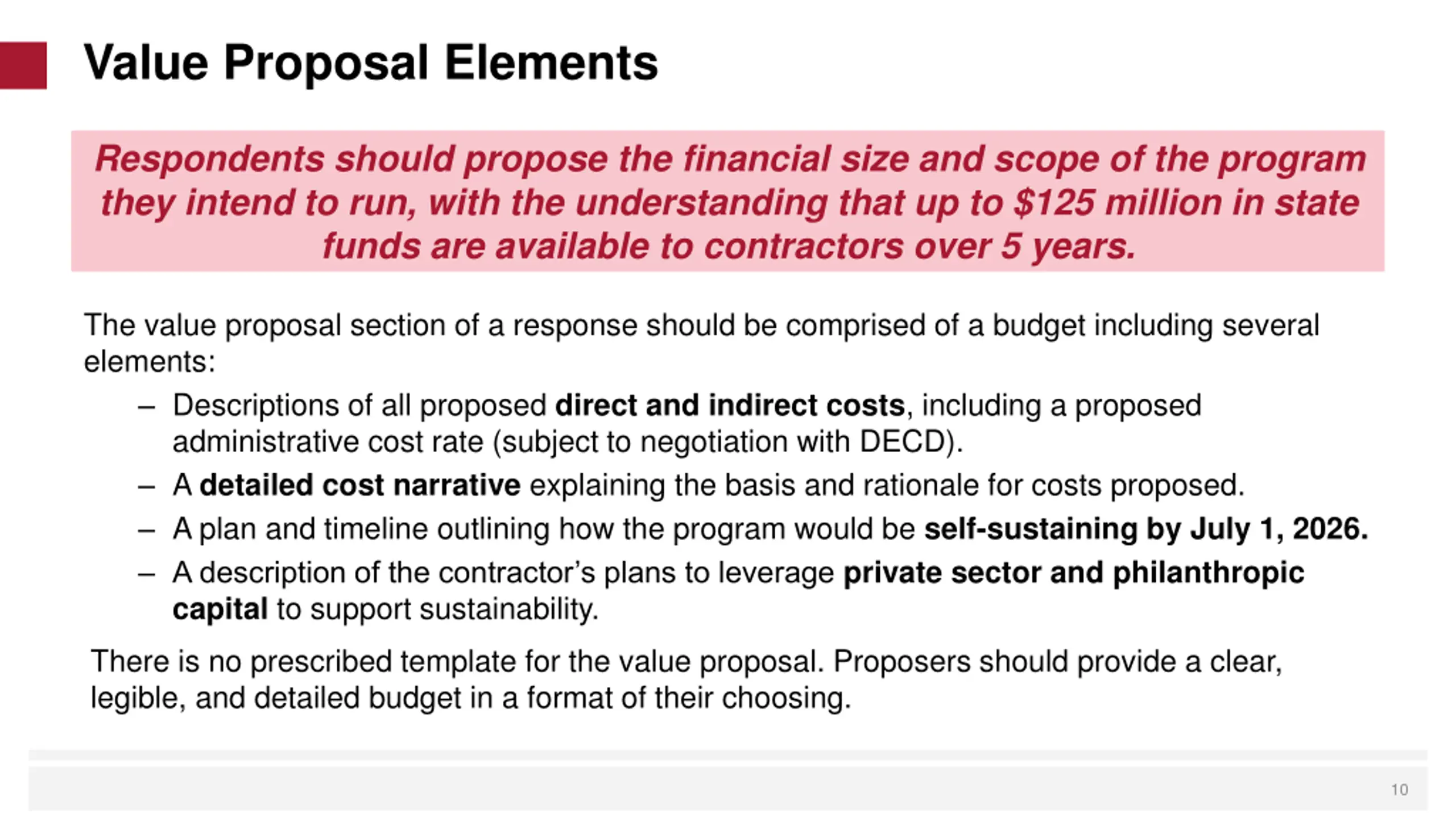 Value Proposal Elements Respondents should propose the financial size and scope of the program they intend to run, with the understanding that up to $125 million in state funds are available to contractors over 5 years. The value proposal section of a response should be comprised of a budget including several elements: Descriptions of all proposed direct and indirect costs, including a proposed administrative cost rate (subject to negotiation with DECD). A detailed cost narrative explaining the basis and rationale for costs proposed. A plan and timeline outlining how the program would be self-sustaining by July 1, 2026. A description of the contractor s plans to leverage private sector and philanthropic capital to support sustainability. There is no prescribed template for the value proposal. Proposers should provide a clear, legible, and detailed budget in a format of their choosing. 10