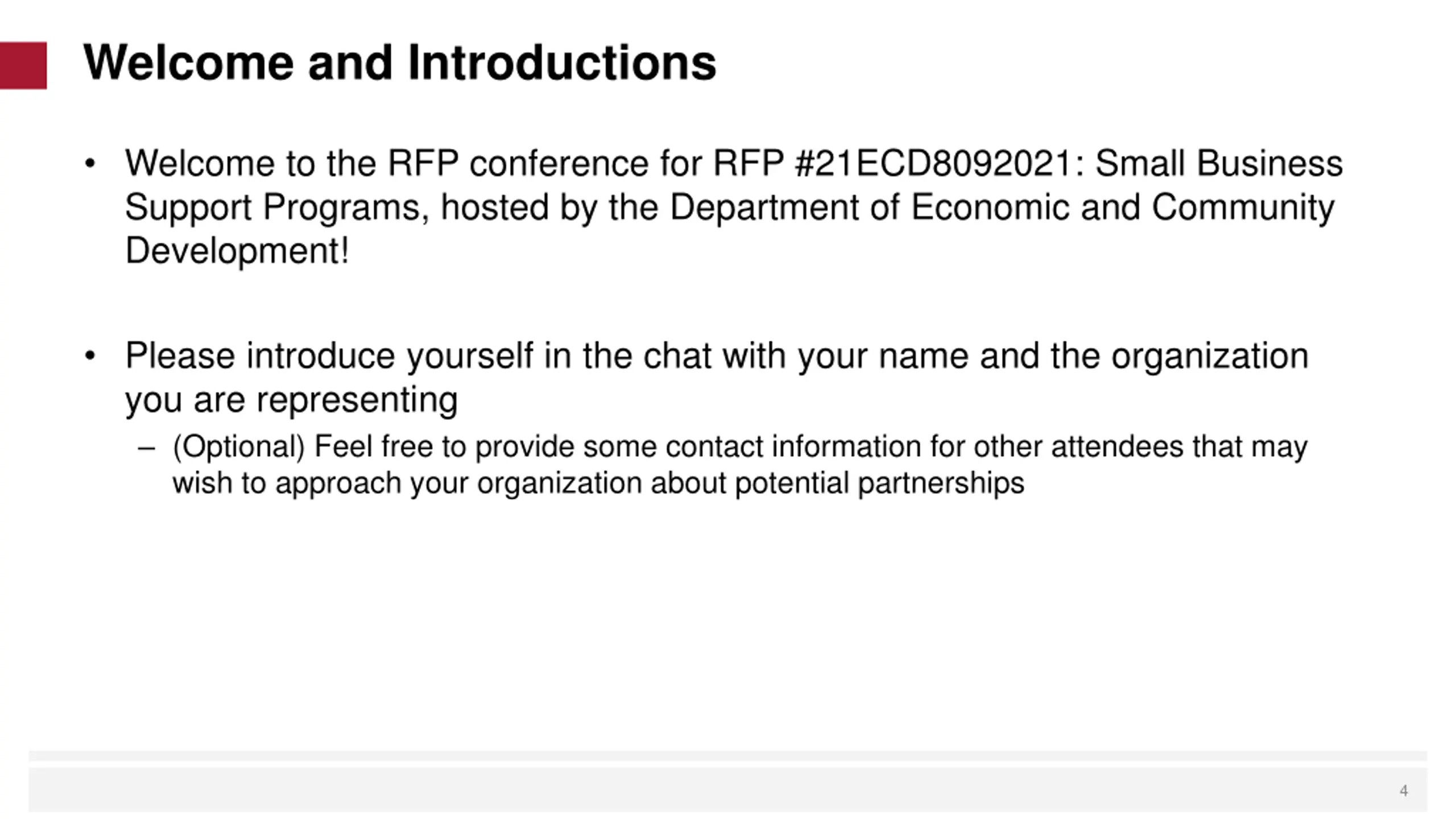 Welcome and Introductions Welcome to the RFP conference for RFP #21ECD8092021: Small Business Support Programs, hosted by the Department of Economic and Community Development! Please introduce yourself in the chat with your name and the organization you are representing (Optional) Feel free to provide some contact information for other attendees that may wish to approach your organization about potential partnerships 4