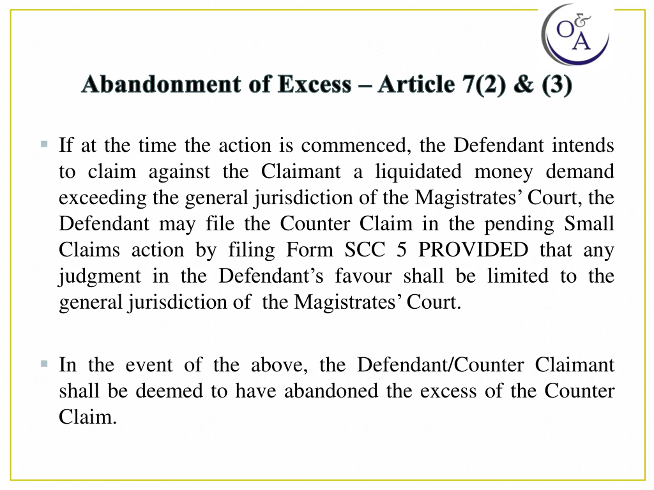 Abandonment of Excess Article 7(2) & (3) If at the time the action is commenced, the Defendant intends to claim against the Claimant a liquidated money demand exceeding the general jurisdiction of the Magistrates Court, the Defendant may file the Counter Claim in the pending Small Claims action by filing Form SCC 5 PROVIDED that any judgment in the Defendant s favour shall be limited to the general jurisdiction of the Magistrates Court. In the event of the above, the Defendant/Counter Claimant shall be deemed to have abandoned the excess of the Counter Claim.