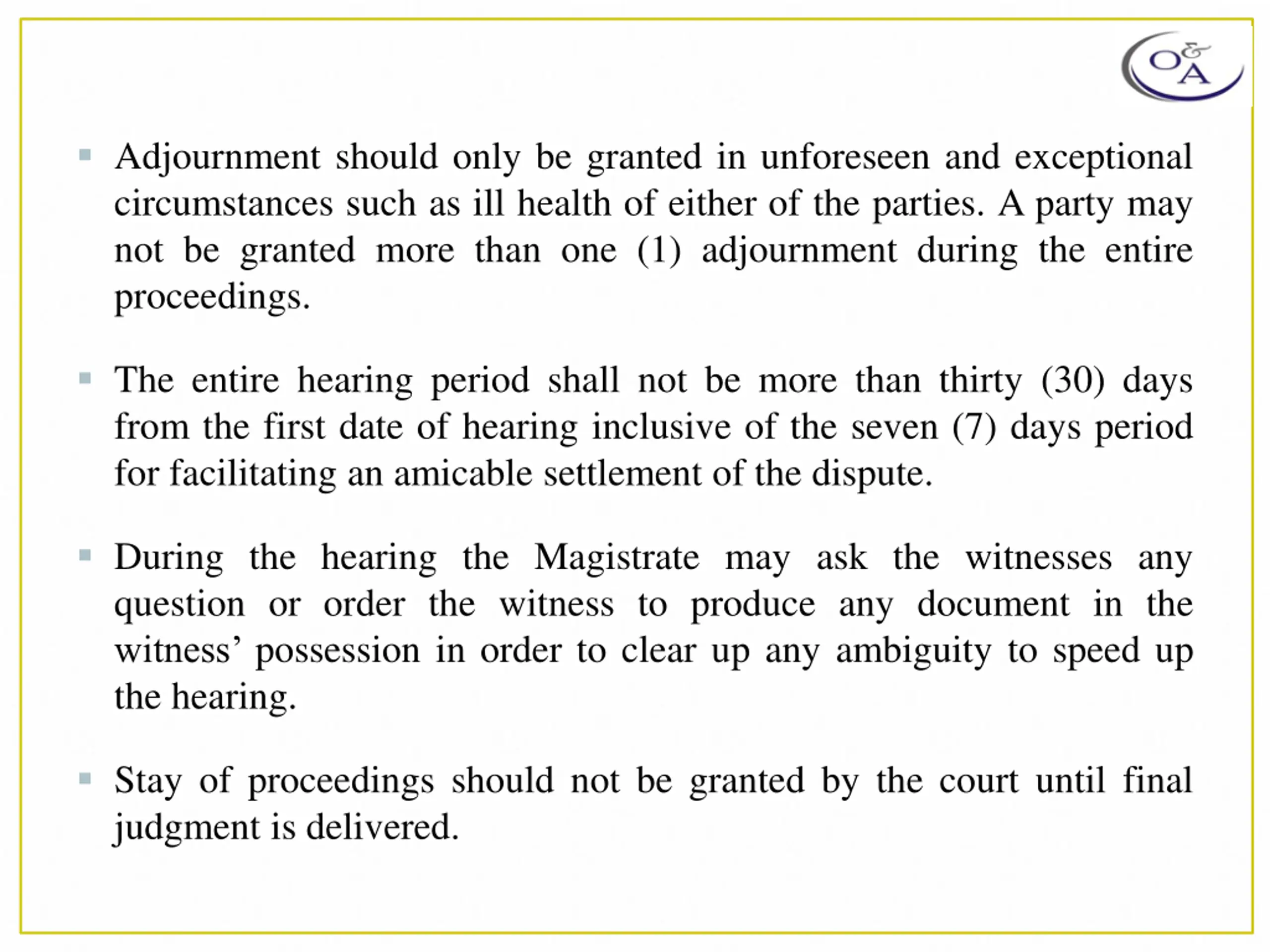 Adjournment should only be granted in unforeseen and exceptional circumstances such as ill health of either of the parties. A party may not be granted more than one (1) adjournment during the entire proceedings. The entire hearing period shall not be more than thirty (30) days from the first date of hearing inclusive of the seven (7) days period for facilitating an amicable settlement of the dispute. During the hearing the Magistrate may ask the witnesses any question or order the witness to produce any document in the witness possession in order to clear up any ambiguity to speed up the hearing. Stay of proceedings should not be granted by the court until final judgment is delivered.