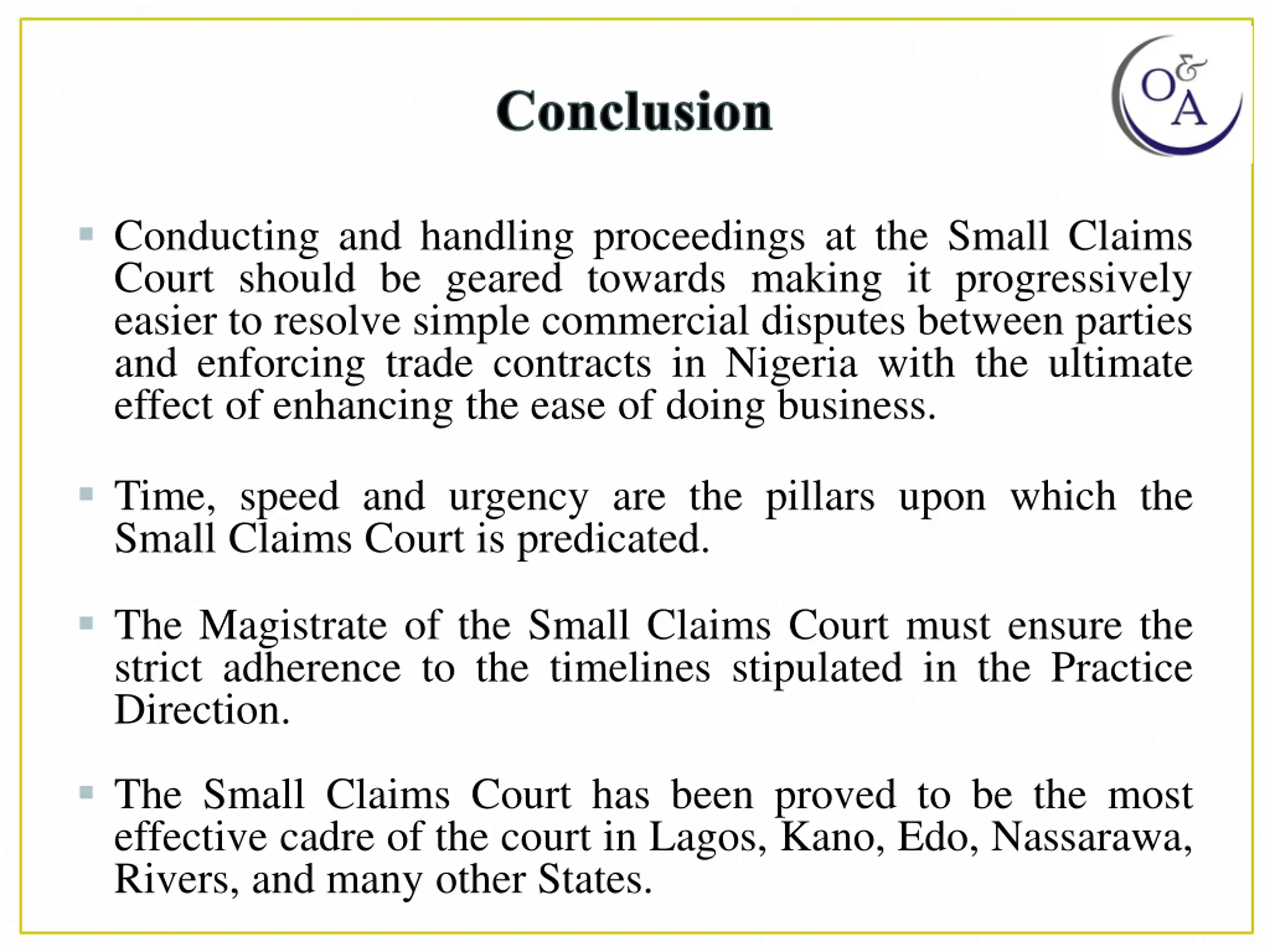 Conclusion Conducting and handling proceedings at the Small Claims Court should be geared towards making it progressively easier to resolve simple commercial disputes between parties and enforcing trade contracts in Nigeria with the ultimate effect of enhancing the ease of doing business. Time, speed and urgency are the pillars upon which the Small Claims Court is predicated. The Magistrate of the Small Claims Court must ensure the strict adherence to the timelines stipulated in the Practice Direction. The Small Claims Court has been proved to be the most effective cadre of the court in Lagos, Kano, Edo, Nassarawa, Rivers, and many other States.